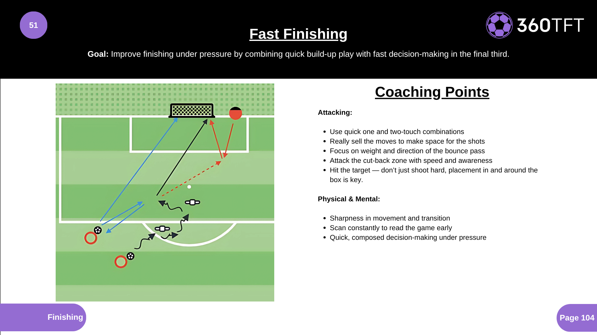 Improve finishing under pressure by combining quick build-up play with fast decision-making in the final third.