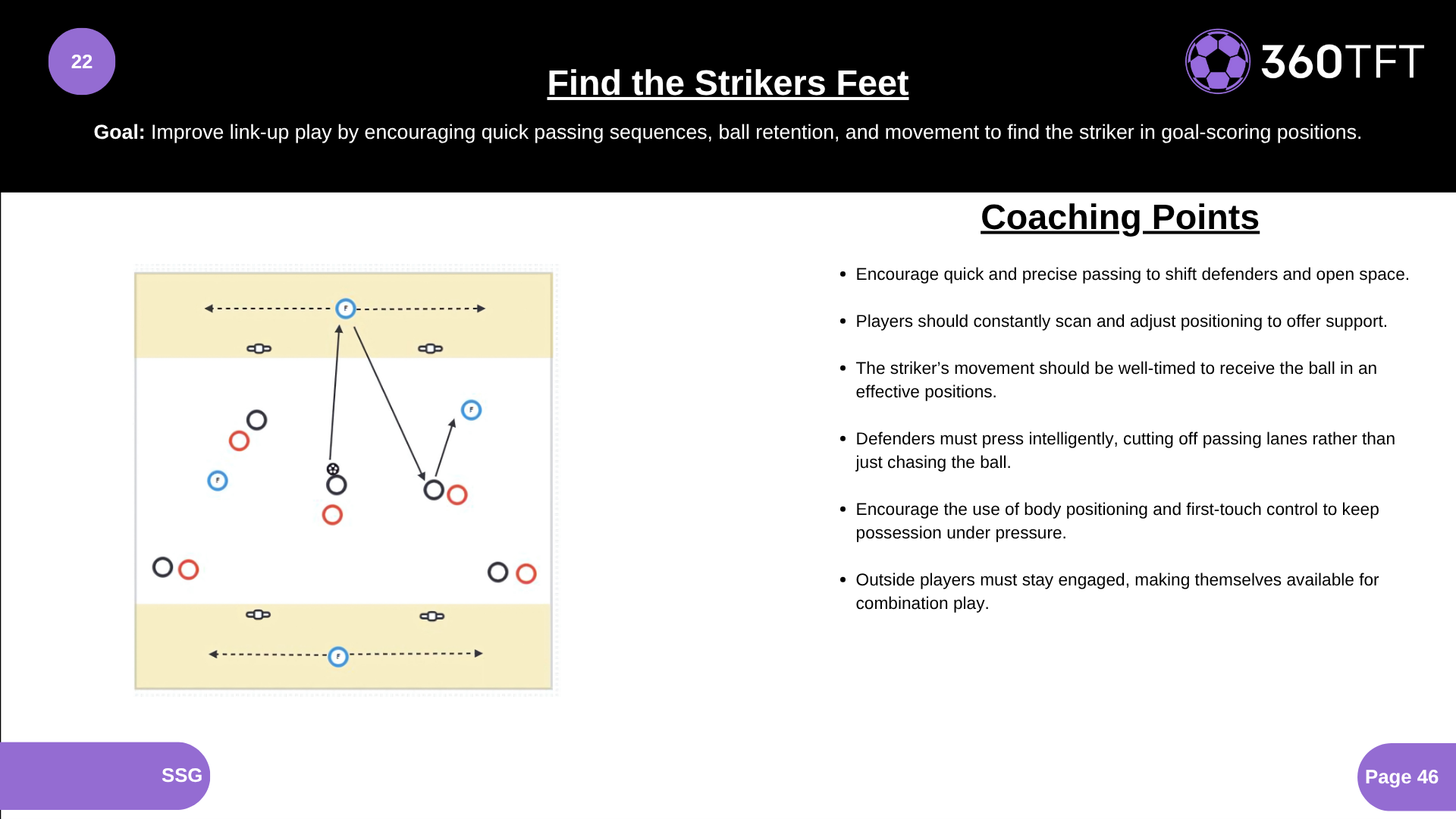 Improve link-up play by encouraging quick passing sequences, ball retention, and movement to find the striker in goal-scoring positions.
