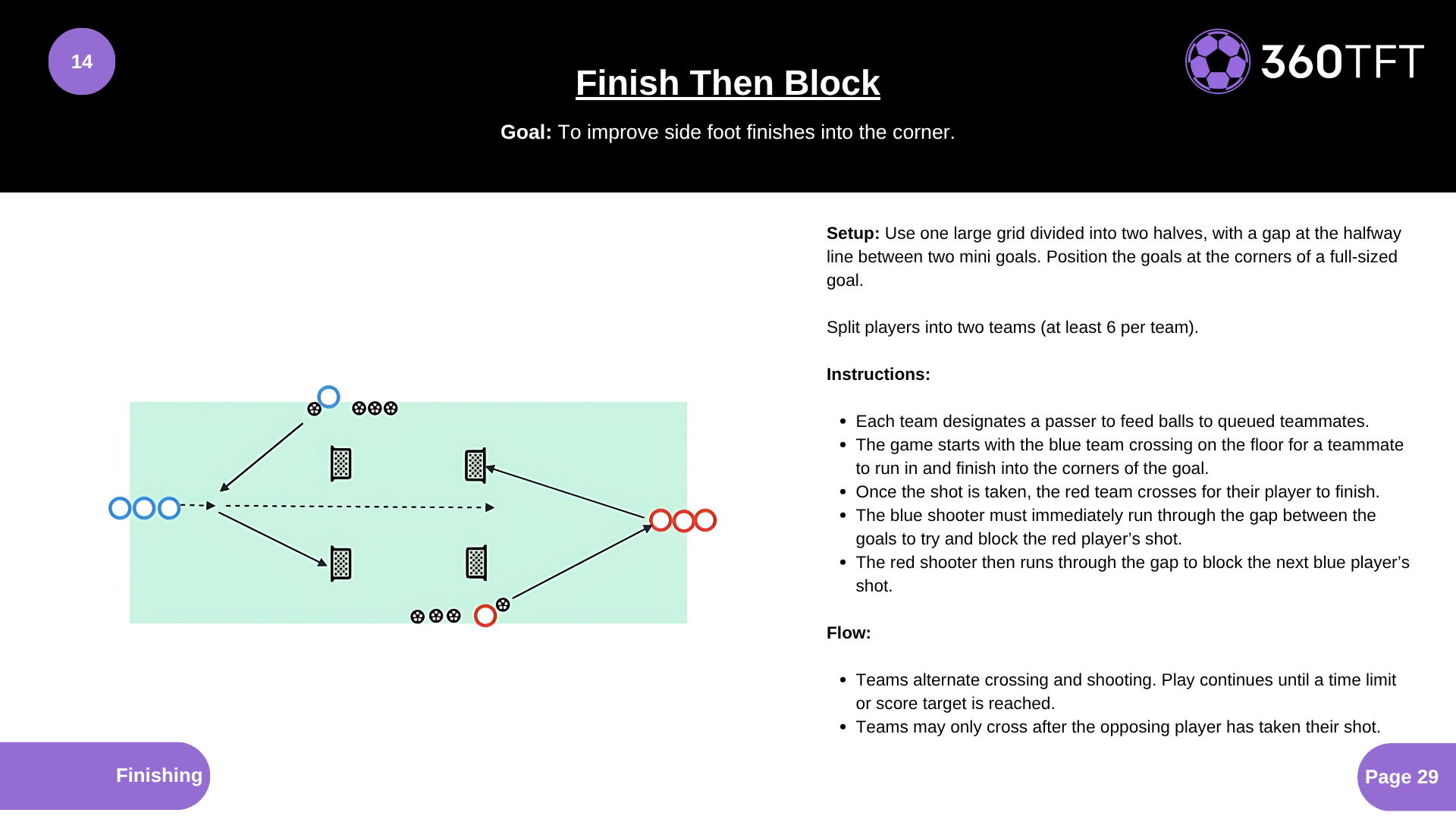 • Each team designates a passer to feed balls to queued teammates. • The game starts with the blue team crossing on the floor for a teammate to run in and finish into the corners of the goal. • Once the shot is taken, the red team crosses for their player to finish. • The blue shooter must immediately run through the gap between the goals to try and block the red player’s shot. • The red shooter then runs through the gap to block the next blue player’s shot.