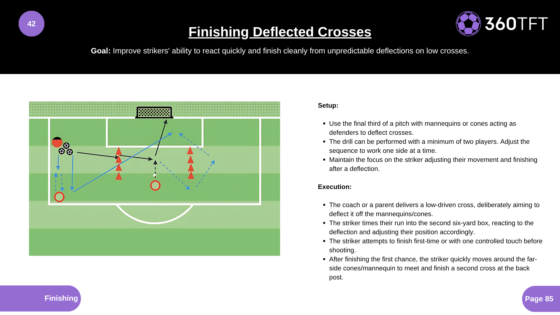 Setup: • Use the final third of a pitch with mannequins or cones acting as defenders to deflect crosses. • The drill can be performed with a minimum of two players. Adjust the sequence to work one side at a time. • Maintain the focus on the striker adjusting their movement and finishing after a deflection. Execution: • The coach or a parent delivers a low-driven cross, deliberately aiming to deflect it off the mannequins/cones. • The striker times their run into the second six-yard box, reacting to the deflection and adjusting their position accordingly. • The striker attempts to finish first-time or with one controlled touch before shooting. • After finishing the first chance, the striker quickly moves around the far-side cones/mannequin to meet and finish a second cross at the back post.