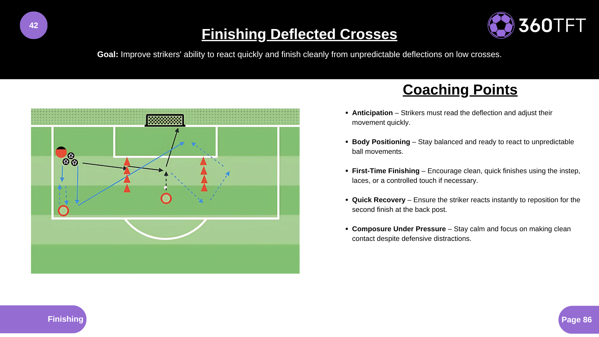 • Anticipation – Strikers must read the deflection and adjust their movement quickly. • Body Positioning – Stay balanced and ready to react to unpredictable ball movements. • First-Time Finishing – Encourage clean, quick finishes using the instep, laces, or a controlled touch if necessary. • Quick Recovery – Ensure the striker reacts instantly to reposition for the second finish at the back post. • Composure Under Pressure – Stay calm and focus on making clean contact despite defensive distractions.