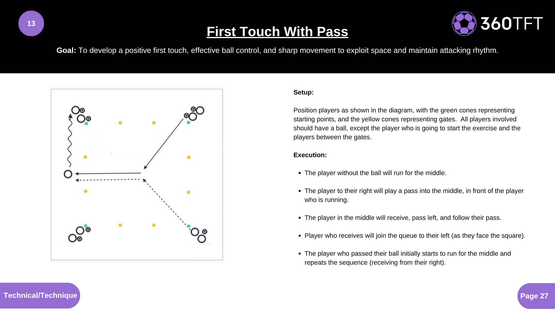 To develop a positive first touch, effective ball control, and sharp movement to exploit space and maintain attacking rhythm.