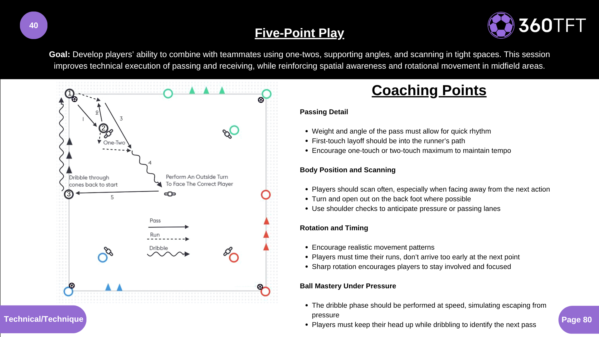 Passing Detail • Weight and angle of the pass must allow for quick rhythm • First-touch layoff should be into the runner’s path • Encourage one-touch or two-touch maximum to maintain tempo Body Position and Scanning • Players should scan often, especially when facing away from the next action • Turn and open out on the back foot where possible • Use shoulder checks to anticipate pressure or passing lanes Rotation and Timing • Encourage realistic movement patterns • Players must time their runs, don’t arrive too early at the next point • Sharp rotation encourages players to stay involved and focused Ball Mastery Under Pressure • The dribble phase should be performed at speed, simulating escaping from pressure • Players must keep their head up while dribbling to identify the next pass