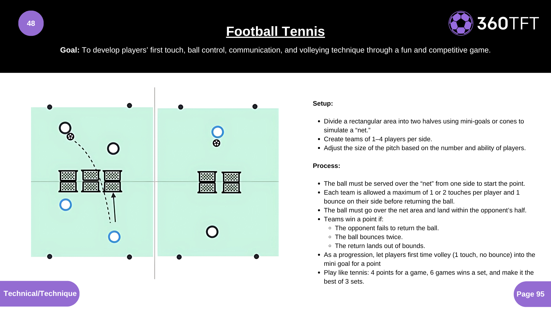 To develop players’ first touch, ball control, communication, and volleying technique through a fun and competitive game.