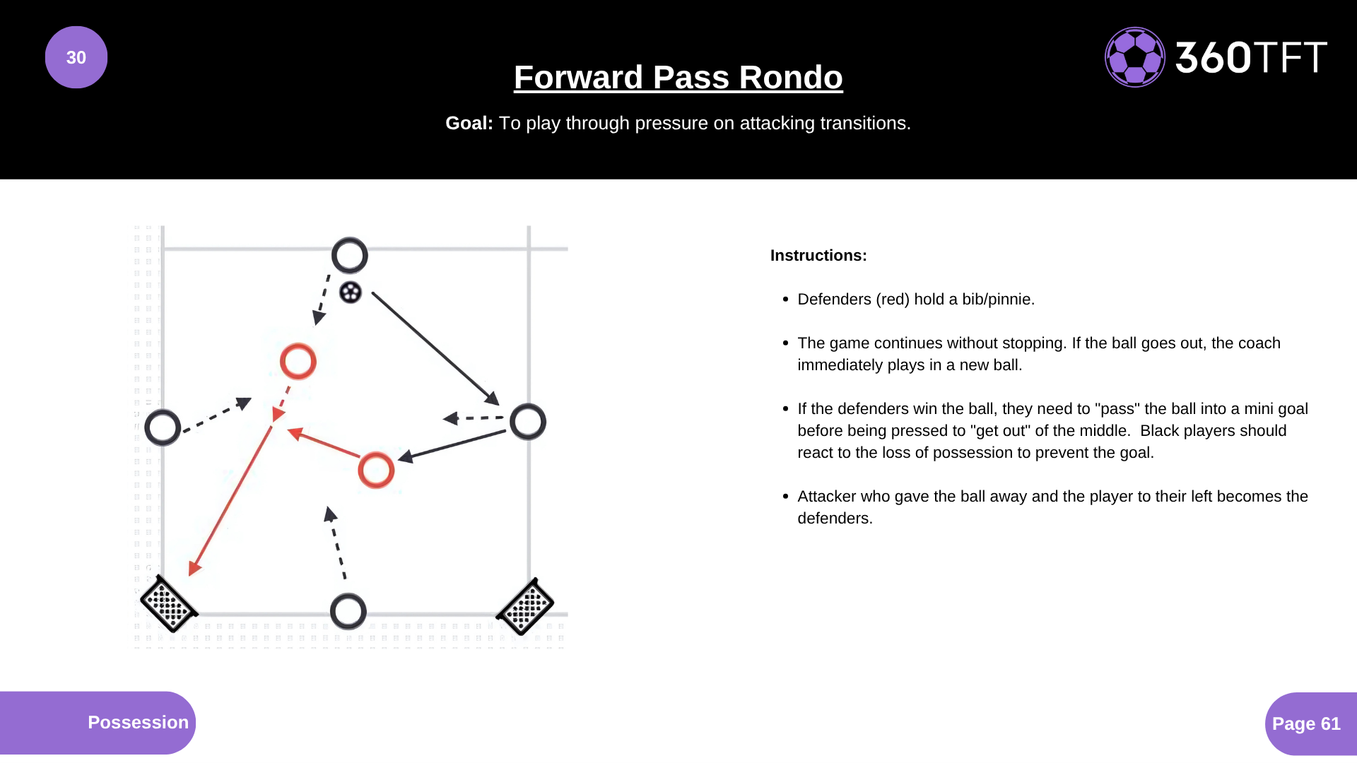 • Defenders (red) hold a bib/pinnie. • The game continues without stopping. If the ball goes out, the coach immediately plays in a new ball. • If the defenders win the ball, they need to "pass" the ball into a mini goal before being pressed to "get out" of the middle. Black players should react to the loss of possession to prevent the goal. • Attacker who gave the ball away and the player to their left becomes the defenders.