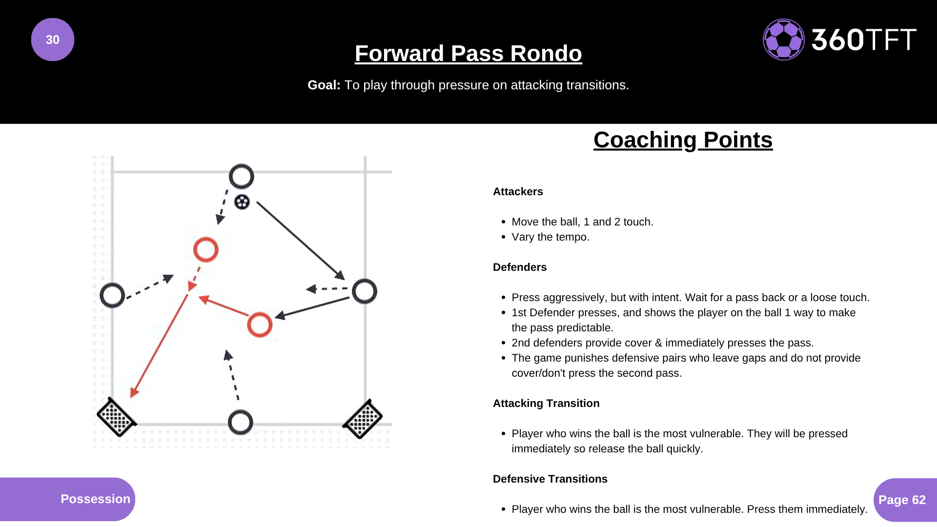 Attackers • Move the ball, 1 and 2 touch. • Vary the tempo. Defenders • Press aggressively, but with intent. Wait for a pass back or a loose touch. • 1st Defender presses, and shows the player on the ball 1 way to make the pass predictable. • 2nd defenders provide cover & immediately presses the pass. • The game punishes defensive pairs who leave gaps and do not provide cover/don't press the second pass. Attacking Transition • Player who wins the ball is the most vulnerable. They will be pressed immediately so release the ball quickly. Defensive Transitions • Player who wins the ball is the most vulnerable. Press them immediately.