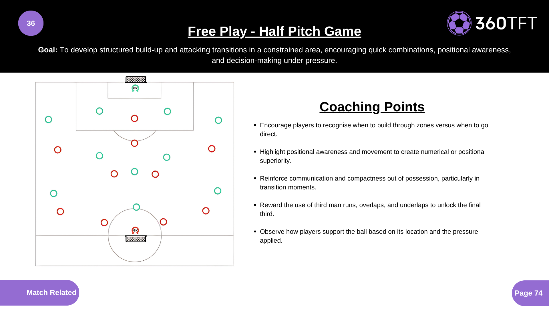 • Encourage players to recognise when to build through zones versus when to go direct. • Highlight positional awareness and movement to create numerical or positional superiority. • Reinforce communication and compactness out of possession, particularly in transition moments. • Reward the use of third man runs, overlaps, and underlaps to unlock the final third. • Observe how players support the ball based on its location and the pressure applied.