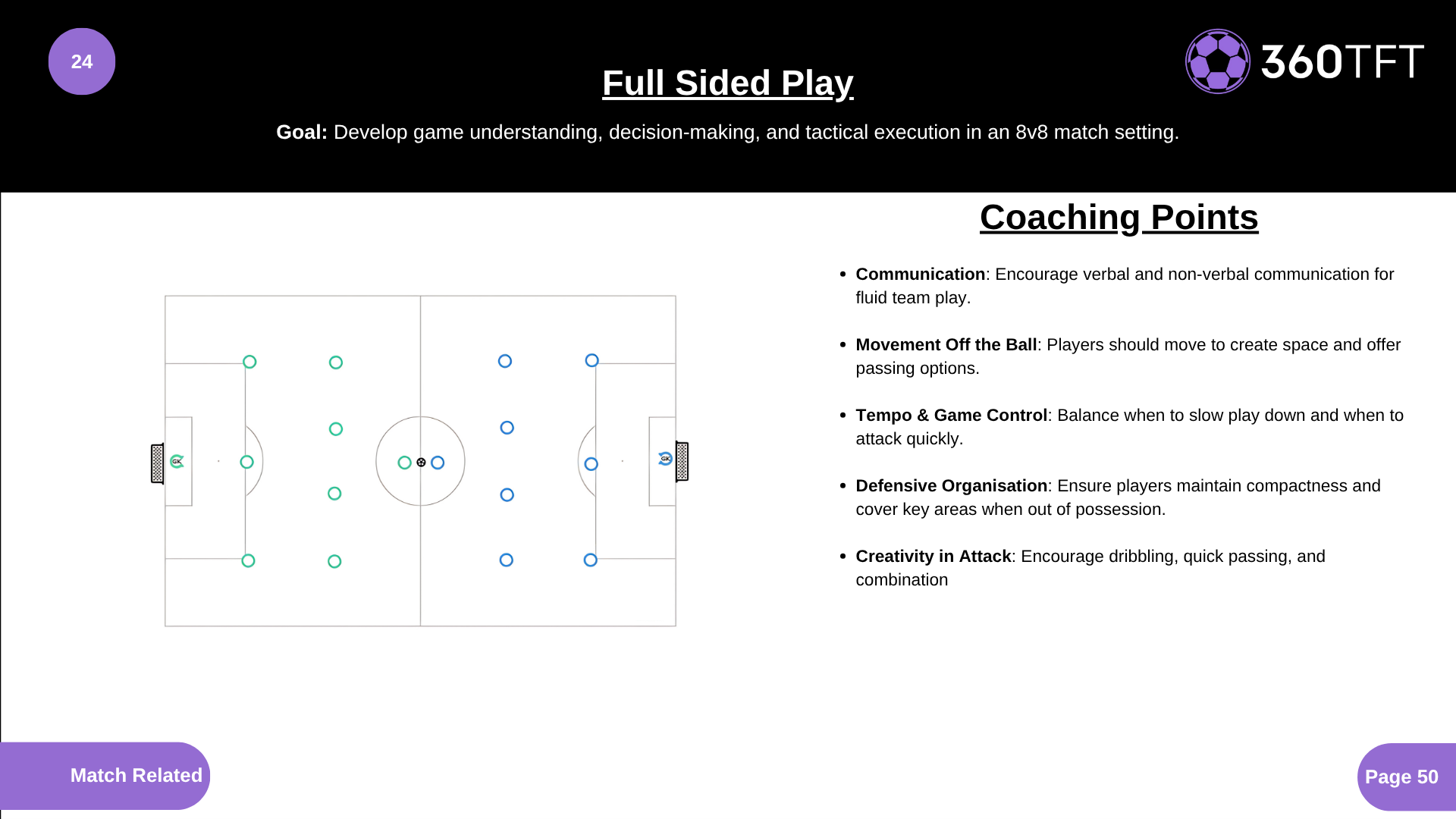 • Communication: Encourage verbal and non-verbal communication for fluid team play. • Movement Off the Ball: Players should move to create space and offer passing options. • Tempo & Game Control: Balance when to slow play down and when to attack quickly. • Defensive Organisation: Ensure players maintain compactness and cover key areas when out of possession. • Creativity in Attack: Encourage dribbling, quick passing, and combination.