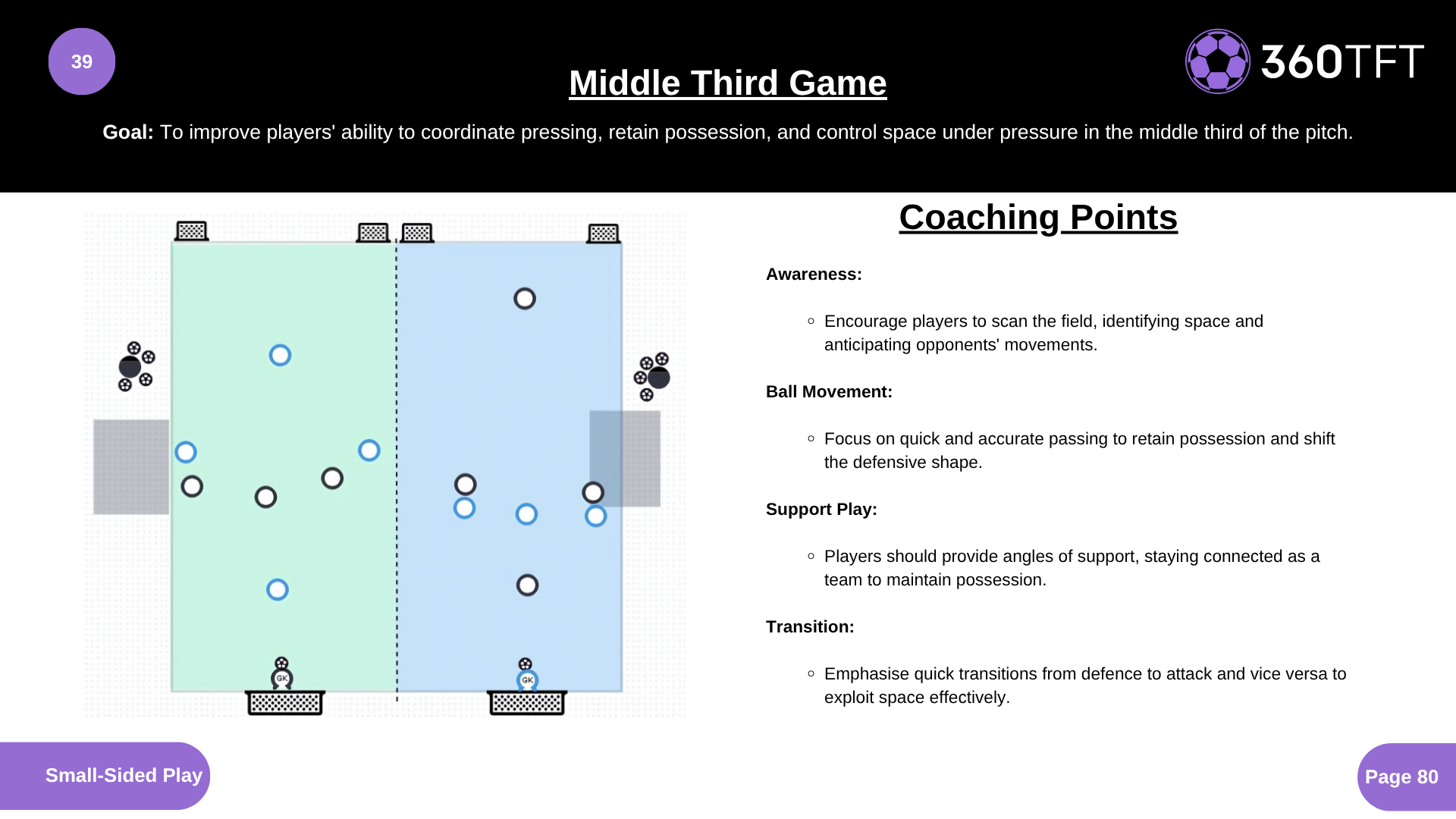 Awareness: Encourage players to scan the field, identifying space and anticipating opponents' movements. Ball Movement: Focus on quick and accurate passing to retain possession and shift the defensive shape. Support Play: Players should provide angles of support, staying connected as a team to maintain possession. Transition: Emphasise quick transitions from defence to attack and vice versa to exploit space effectively.
