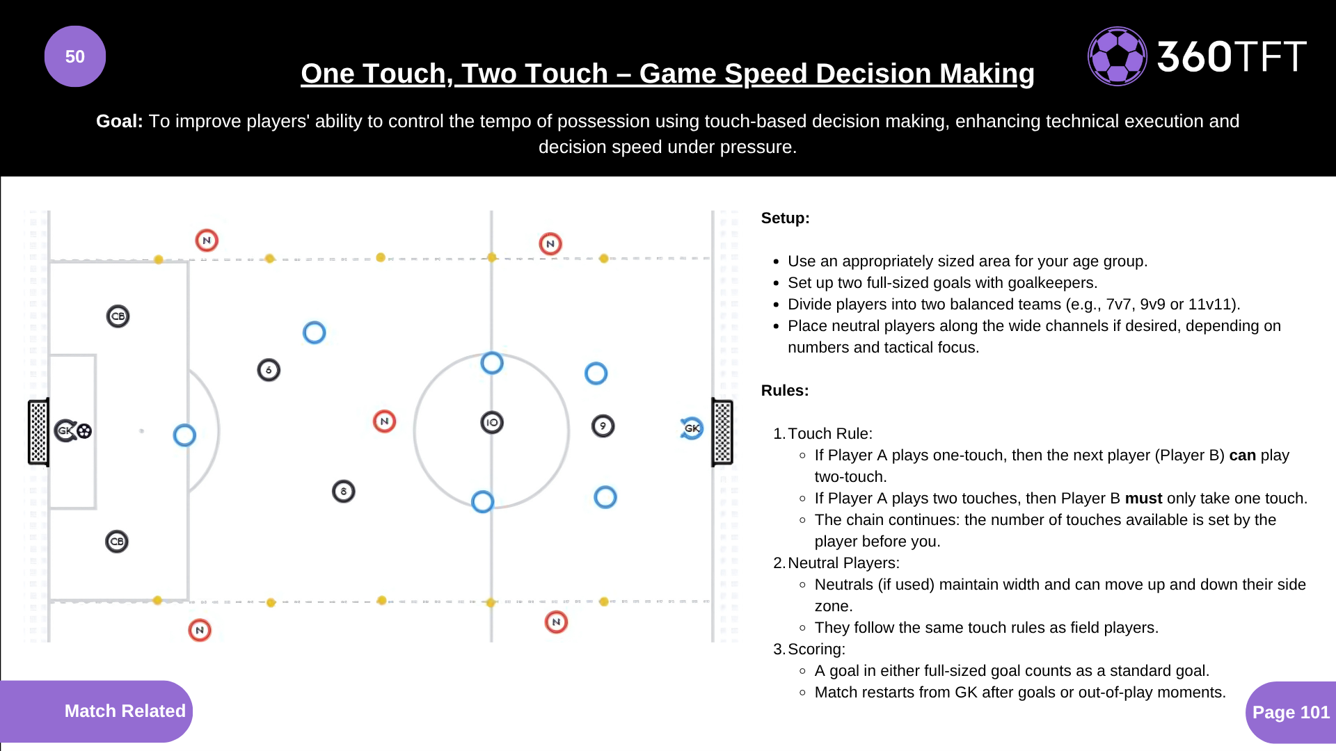 • Use an appropriately sized area for your age group. • Set up two full-sized goals with goalkeepers. • Divide players into two balanced teams (e.g., 7v7, 9v9 or 11v11). • Place neutral players along the wide channels if desired, depending on numbers and tactical focus. • Touch Rule: If Player A plays one-touch, then the next player (Player B) can play two-touch. If Player A plays two touches, then Player B must only take one touch. The chain continues: the number of touches available is set by the player before you. • Neutral Players: Neutrals (if used) maintain width and can move up and down their side zone. They follow the same touch rules as field players. • Scoring: A goal in either full-sized goal counts as a standard goal. Match restarts from GK after goals or out-of-play moments.