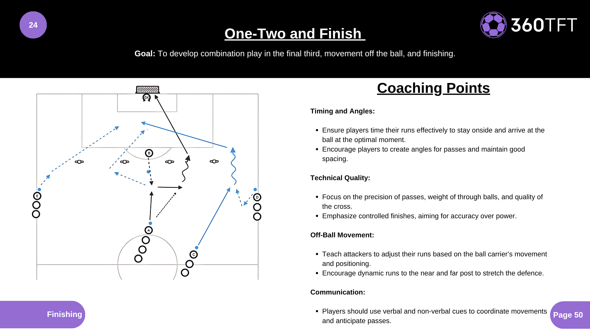 Timing and Angles: • Ensure players time their runs effectively to stay onside and arrive at the ball at the optimal moment. • Encourage players to create angles for passes and maintain good spacing. Technical Quality: • Focus on the precision of passes, weight of through balls, and quality of the cross. • Emphasize controlled finishes, aiming for accuracy over power. Off-Ball Movement: • Teach attackers to adjust their runs based on the ball carrier’s movement and positioning. • Encourage dynamic runs to the near and far post to stretch the defence. Communication: • Players should use verbal and non-verbal cues to coordinate movements and anticipate passes.