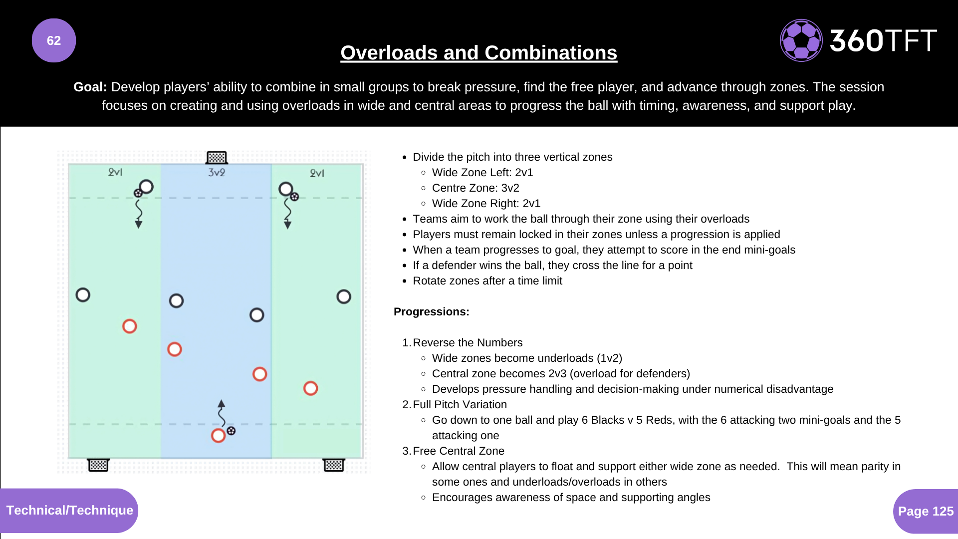 • Divide the pitch into three vertical zones • Wide Zone Left: 2v1 • Centre Zone: 3v2 • Wide Zone Right: 2v1 • Teams aim to work the ball through their zone using their overloads • Players must remain locked in their zones unless a progression is applied • When a team progresses to goal, they attempt to score in the end mini-goals • If a defender wins the ball, they cross the line for a point • Rotate zones after a time limit