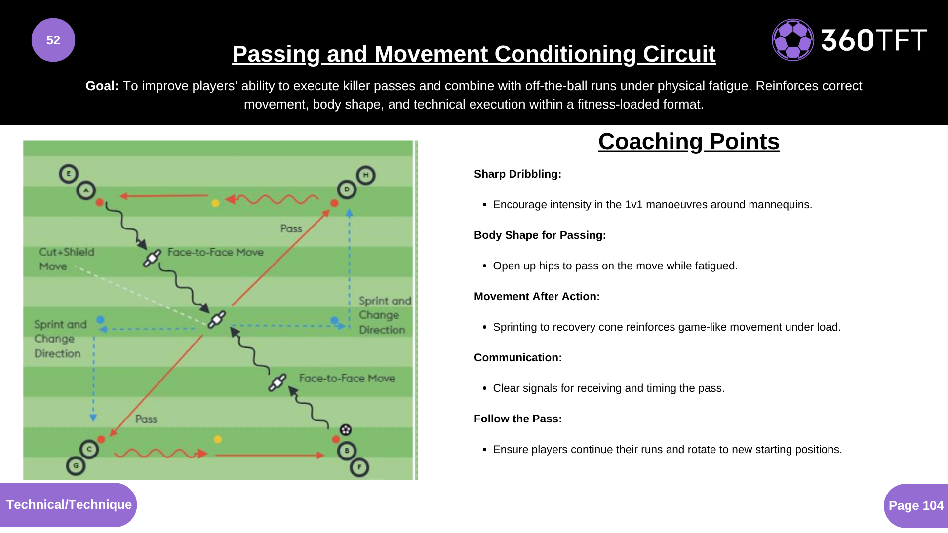 Sharp Dribbling: • Encourage intensity in the 1v1 manoeuvres around mannequins. Body Shape for Passing: • Open up hips to pass on the move while fatigued. Movement After Action: • Sprinting to recovery cone reinforces game-like movement under load. Communication: • Clear signals for receiving and timing the pass. Follow the Pass: • Ensure players continue their runs and rotate to new starting positions.