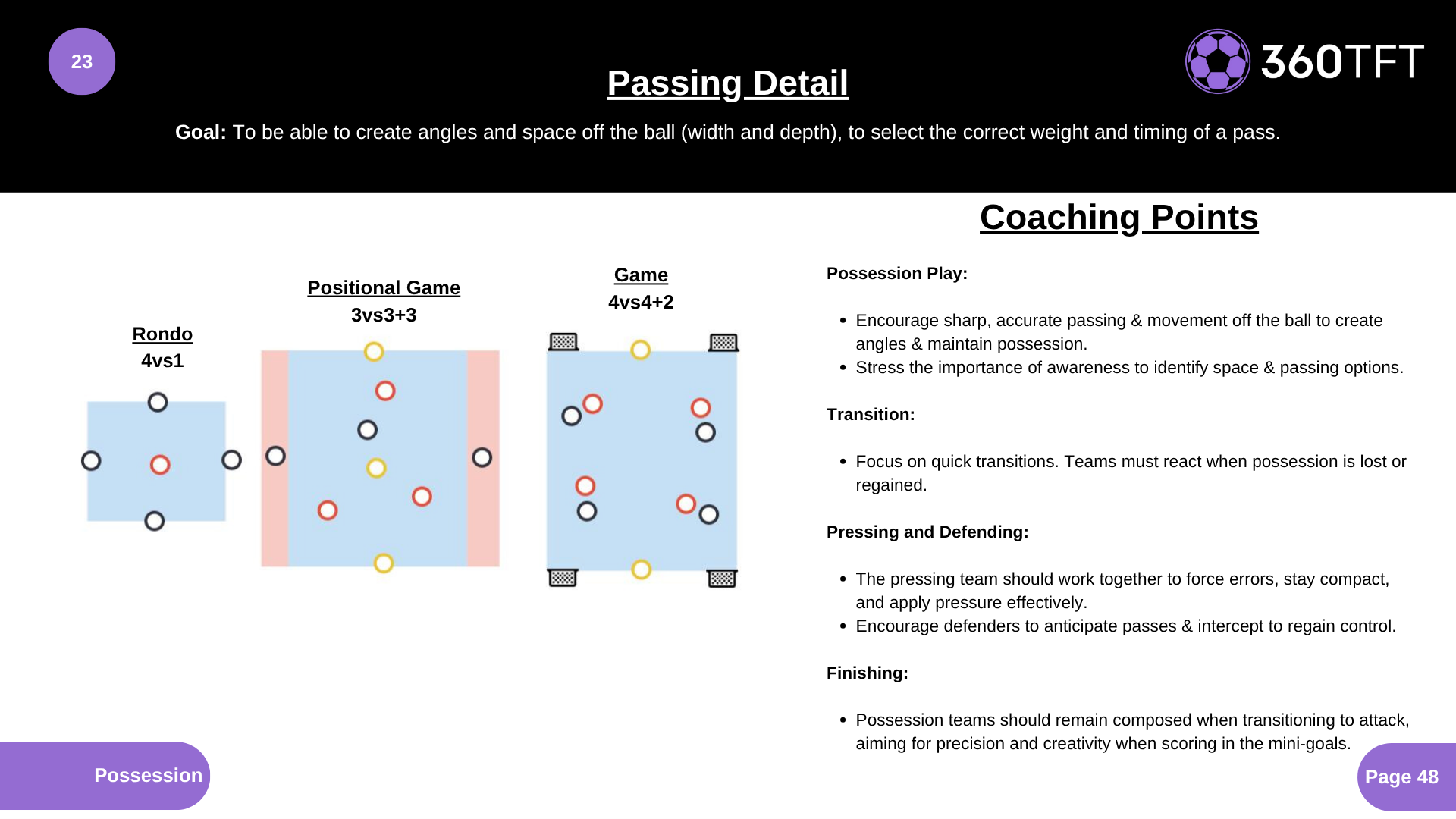 Possession Play: • Encourage sharp, accurate passing & movement off the ball to create angles & maintain possession. • Stress the importance of awareness to identify space & passing options. Transition: • Focus on quick transitions. Teams must react when possession is lost or regained. Pressing and Defending: • The pressing team should work together to force errors, stay compact, and apply pressure effectively. • Encourage defenders to anticipate passes & intercept to regain control. Finishing: • Possession teams should remain composed when transitioning to attack, aiming for precision and creativity when scoring in the mini-goals.