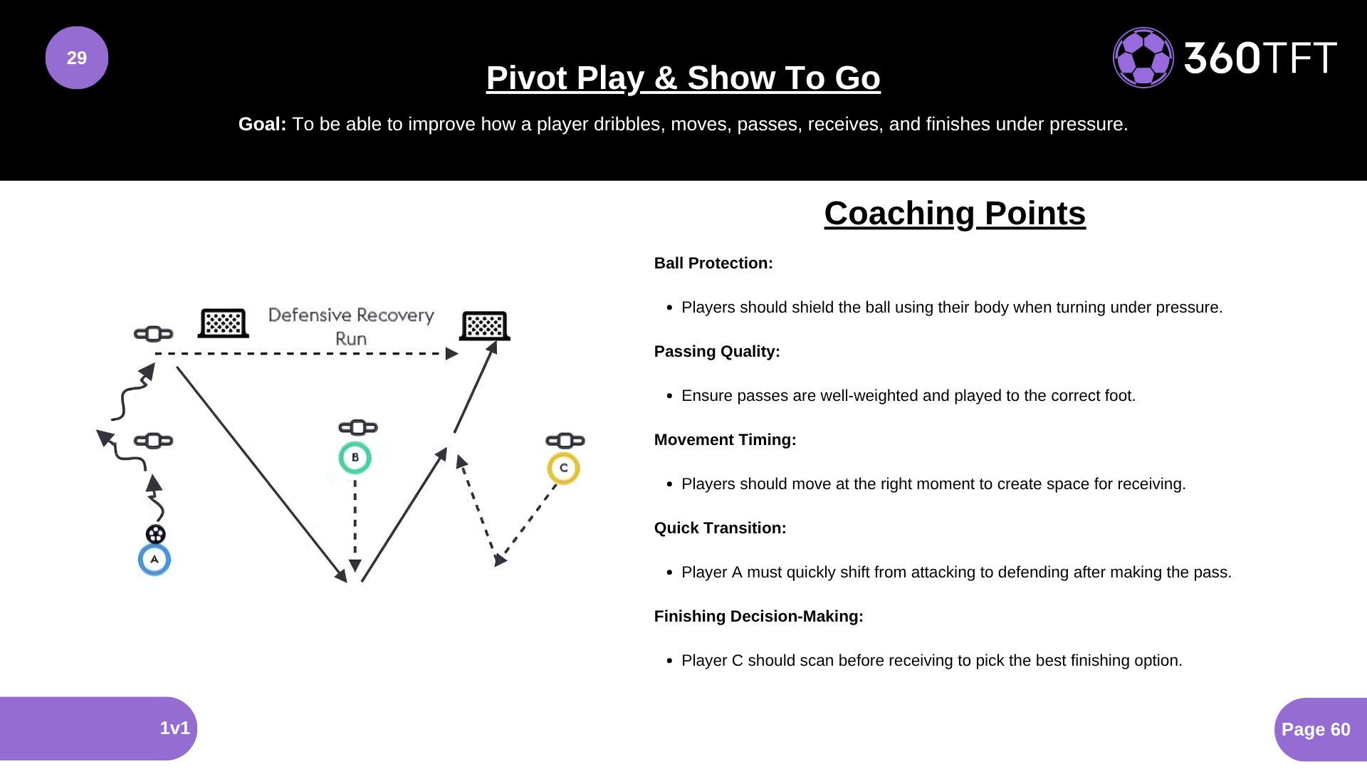 Ball Protection: • Players should shield the ball using their body when turning under pressure. Passing Quality: • Ensure passes are well-weighted and played to the correct foot. Movement Timing: • Players should move at the right moment to create space for receiving. Quick Transition: • Player A must quickly shift from attacking to defending after making the pass. Finishing Decision-Making: • Player C should scan before receiving to pick the best finishing option.