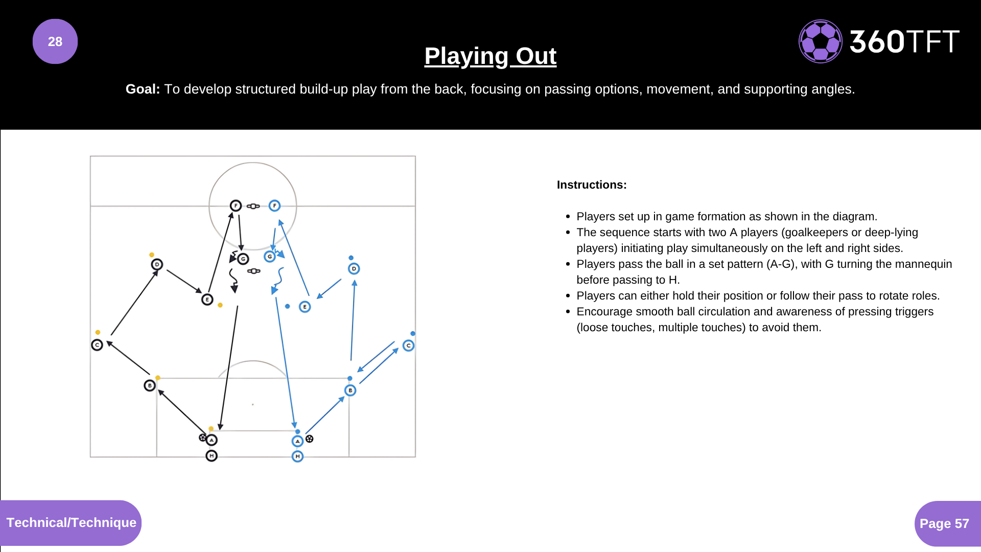 To develop structured build-up play from the back, focusing on passing options, movement, and supporting angles.