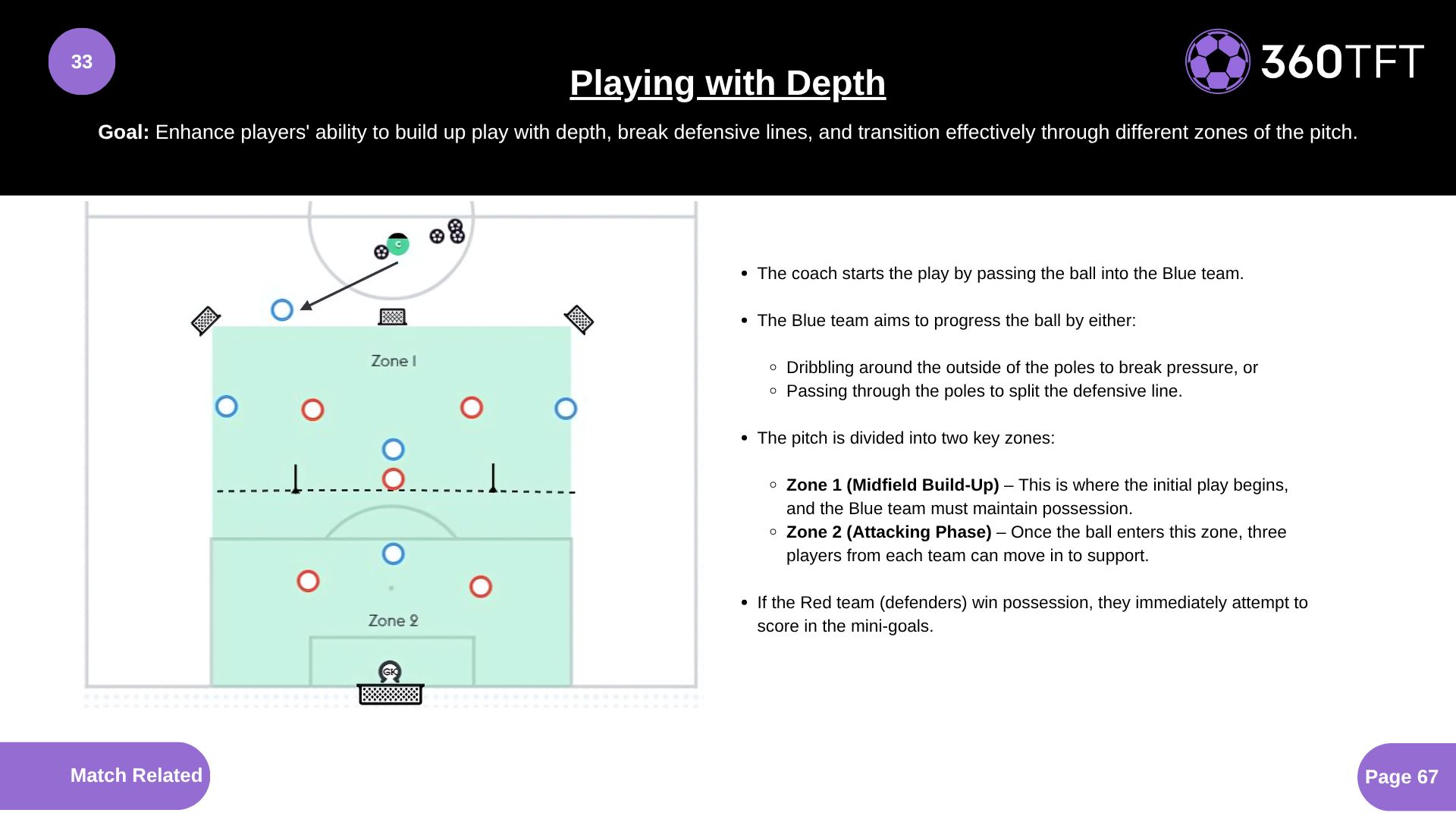 Enhance players' ability to build up play with depth, break defensive lines, and transition effectively through different zones of the pitch.