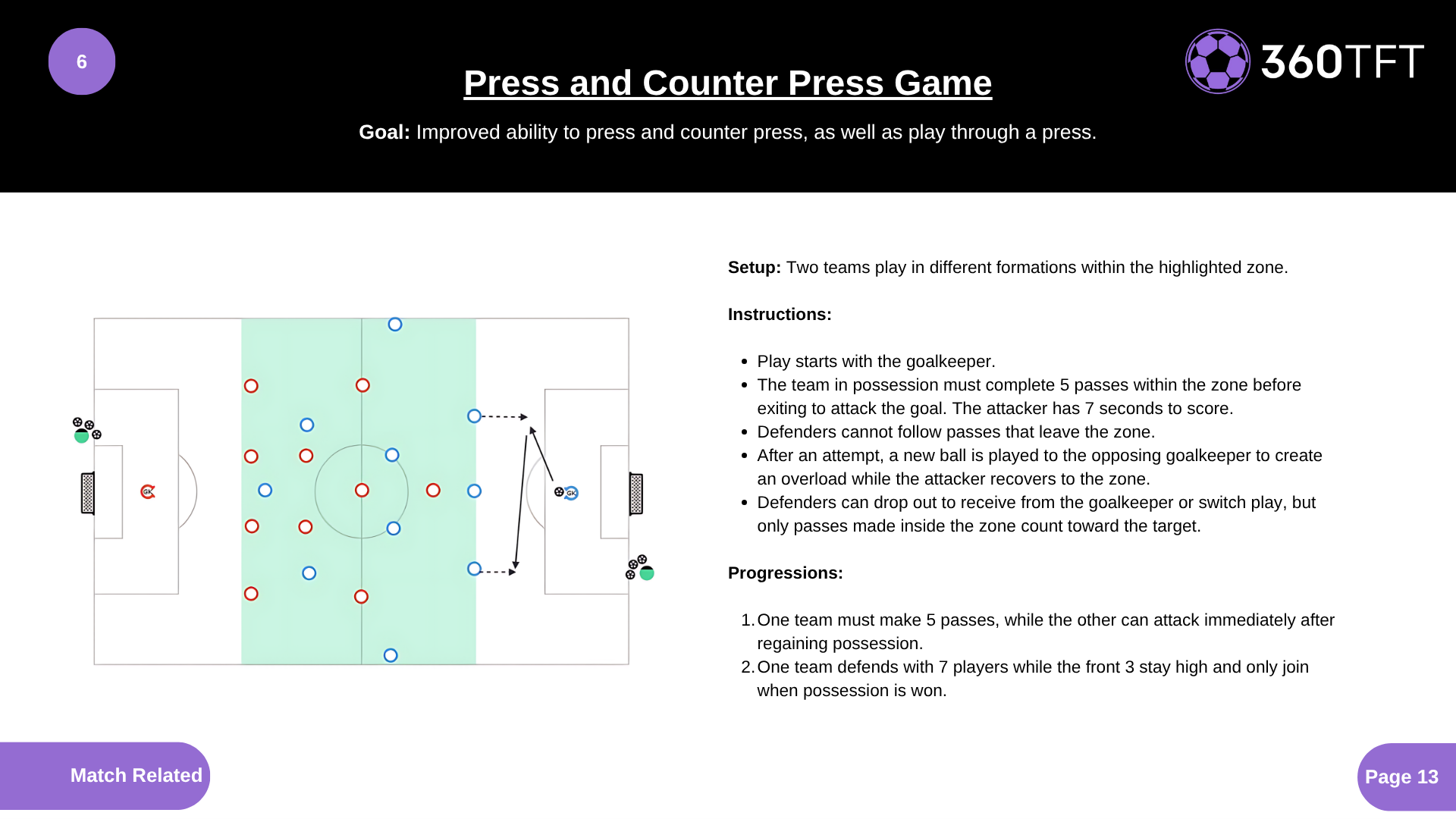 • Play starts with the goalkeeper. • The team in possession must complete 5 passes within the zone before exiting to attack the goal. The attacker has 7 seconds to score. • Defenders cannot follow passes that leave the zone. • After an attempt, a new ball is played to the opposing goalkeeper to create an overload while the attacker recovers to the zone. • Defenders can drop out to receive from the goalkeeper or switch play, but only passes made inside the zone count toward the target.