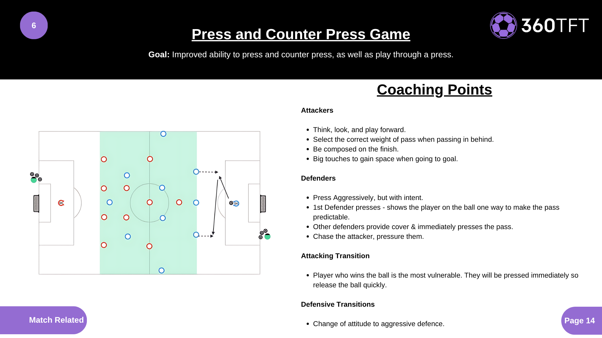 Attacking Points - Think, look, and play forward. - Select the correct weight of pass when passing in behind. - Be composed on the finish. - Big touches to gain space when going to goal. Defenders - Press Aggressively, but with intent. - 1st Defender presses - shows the player on the ball one way to make the pass predictable. - Other defenders provide cover & immediately presses the pass. - Chase the attacker, pressure them. Attacking Transition - Player who wins the ball is the most vulnerable. They will be pressed immediately so release the ball quickly. Defensive Transitions - Change of attitude to aggressive defence.