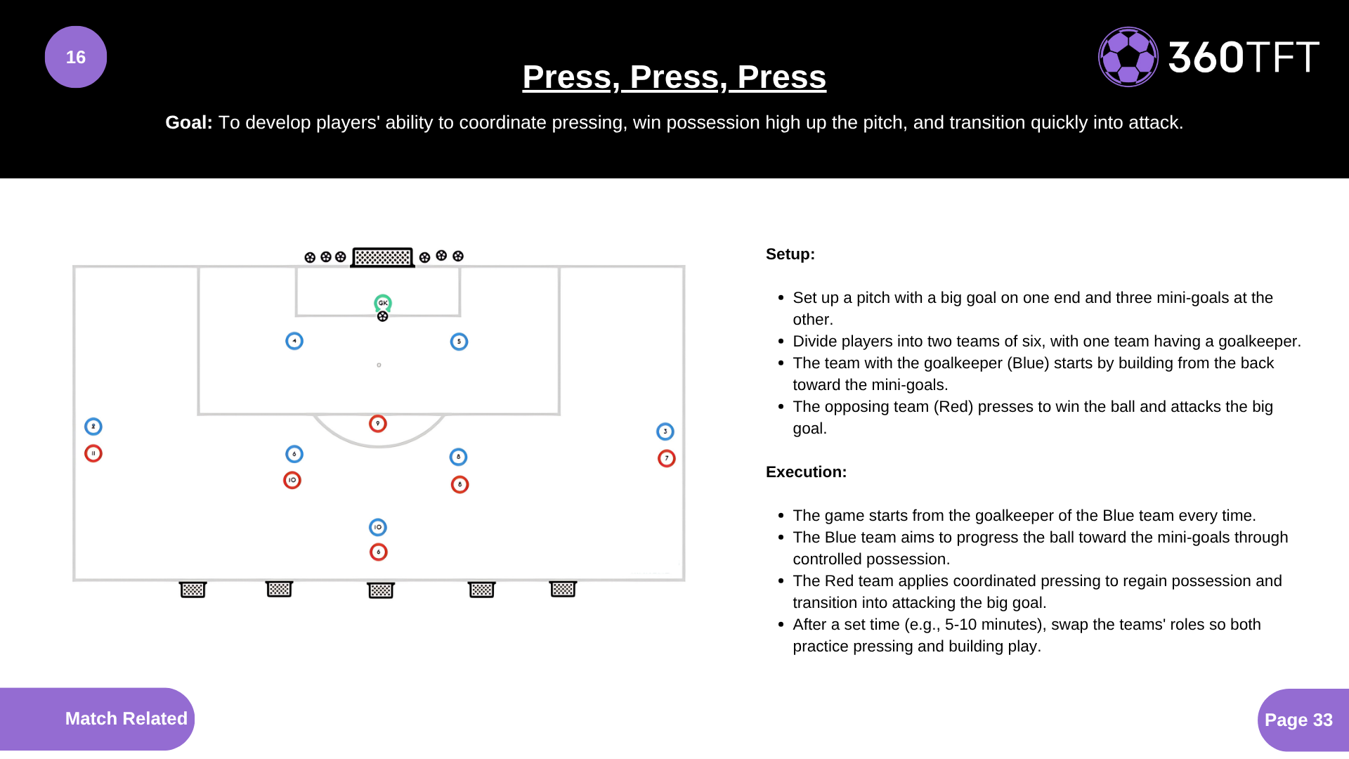 • Set up a pitch with a big goal on one end and three mini-goals at the other. • Divide players into two teams of six, with one team having a goalkeeper. • The team with the goalkeeper (Blue) starts by building from the back toward the mini-goals. • The opposing team (Red) presses to win the ball and attacks the big goal. • The game starts from the goalkeeper of the Blue team every time. • The Blue team aims to progress the ball toward the mini-goals through controlled possession. • The Red team applies coordinated pressing to regain possession and transition into attacking the big goal. • After a set time (e.g., 5-10 minutes), swap the teams' roles so both practice pressing and building play.