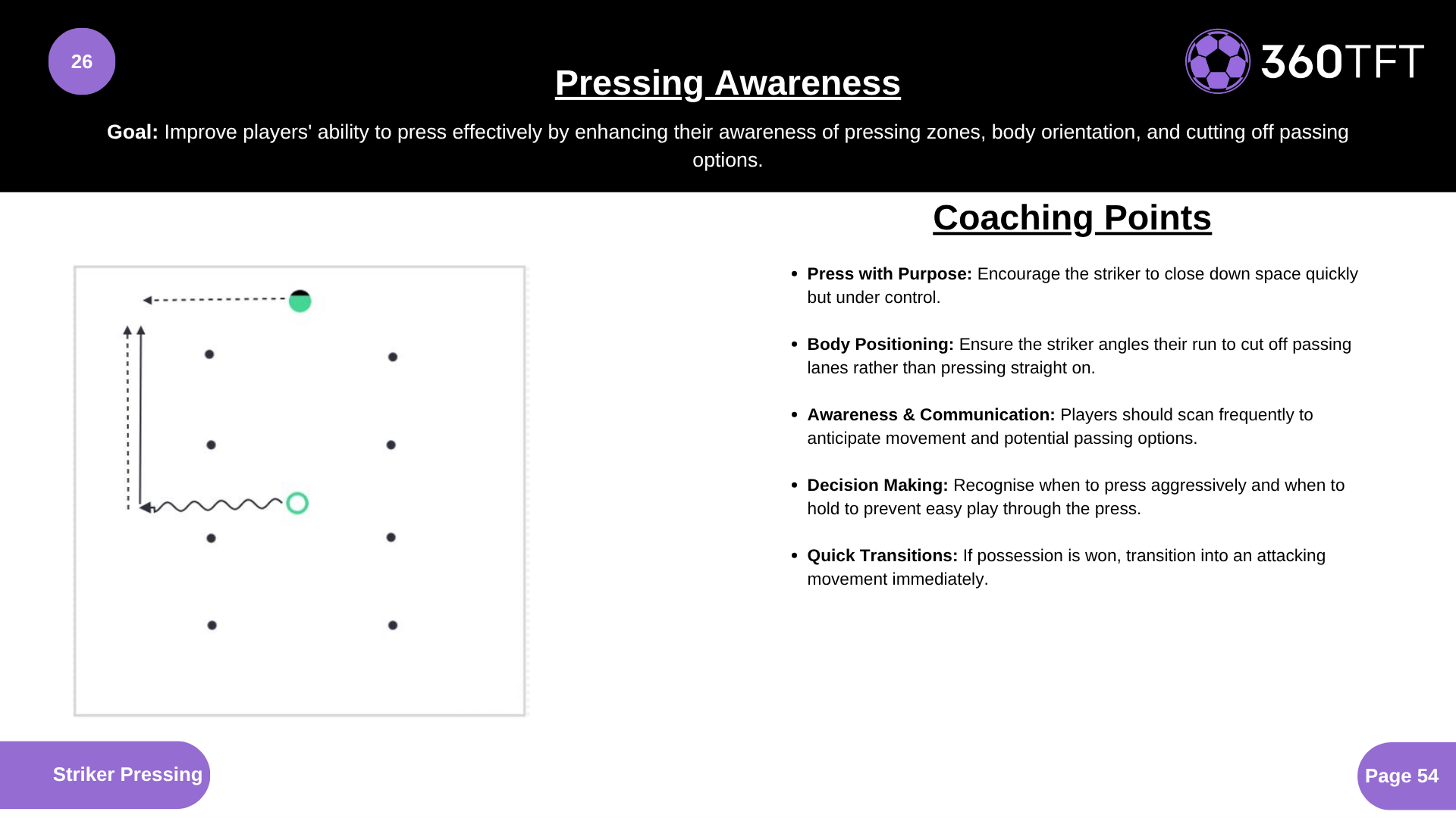 • Press with Purpose: Encourage the striker to close down space quickly but under control. • Body Positioning: Ensure the striker angles to cut off passing lanes rather than pressing straight on. • Awareness & Communication: Players should scan frequently to anticipate movement and potential passing options. • Decision Making: Recognise when to press aggressively and when to hold to prevent easy play through the press. • Quick Transitions: If possession is won, transition into an attacking movement immediately.