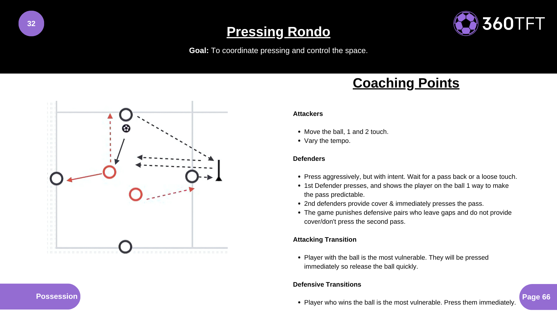 Attackers • Move the ball, 1 and 2 touch. • Vary the tempo. Defenders • Press aggressively, but with intent. Wait for a pass back or a loose touch. • 1st Defender presses, and shows the player on the ball 1 way to make the pass predictable. • 2nd defenders provide cover & immediately presses the pass. • The game punishes defensive pairs who leave gaps and do not provide cover/don't press the second pass. Attacking Transition • Player with the ball is the most vulnerable. They will be pressed immediately so release the ball quickly. Defensive Transitions • Player who wins the ball is the most vulnerable. Press them immediately.