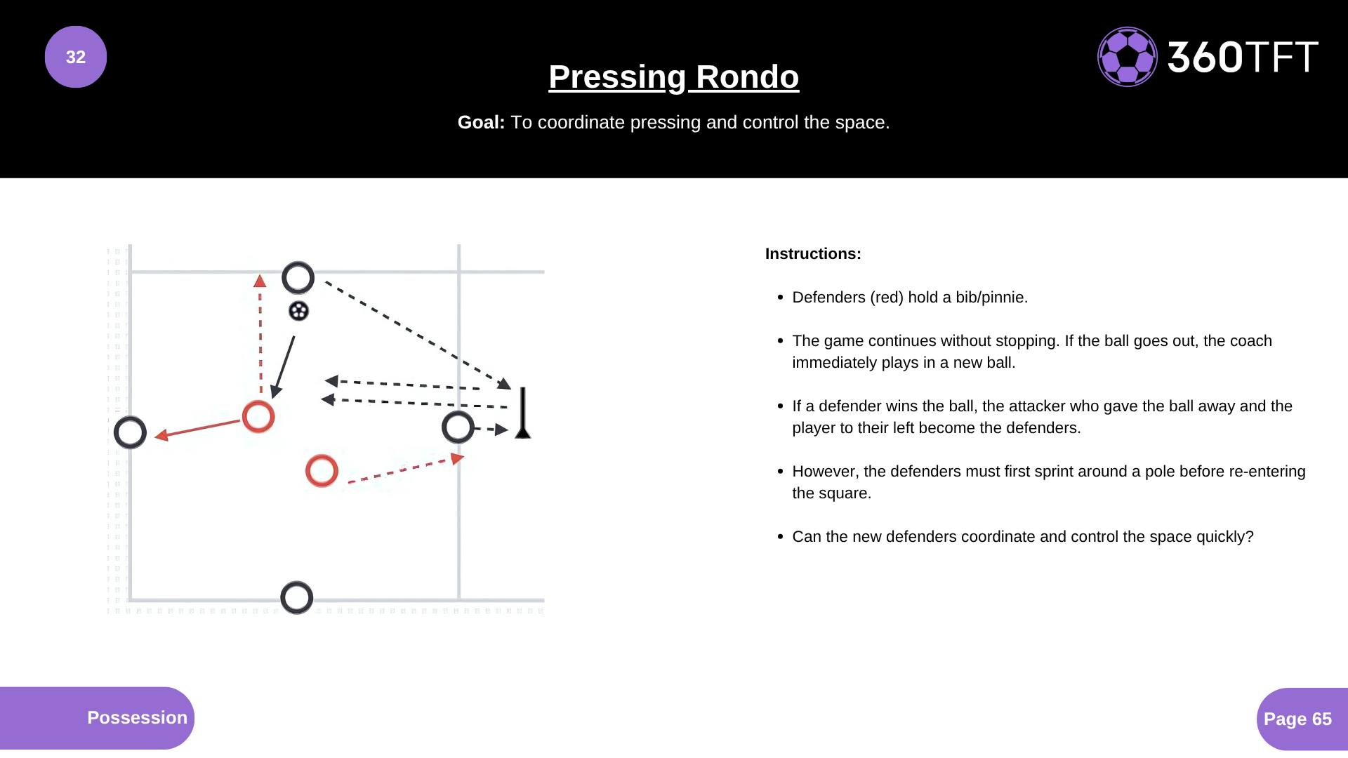 • Defenders (red) hold a bib/pinnie. • The game continues without stopping. If the ball goes out, the coach immediately plays in a new ball. • If a defender wins the ball, the attacker who gave the ball away and the player to their left become the defenders. • However, the defenders must first sprint around a pole before re-entering the square. • Can the new defenders coordinate and control the space quickly?