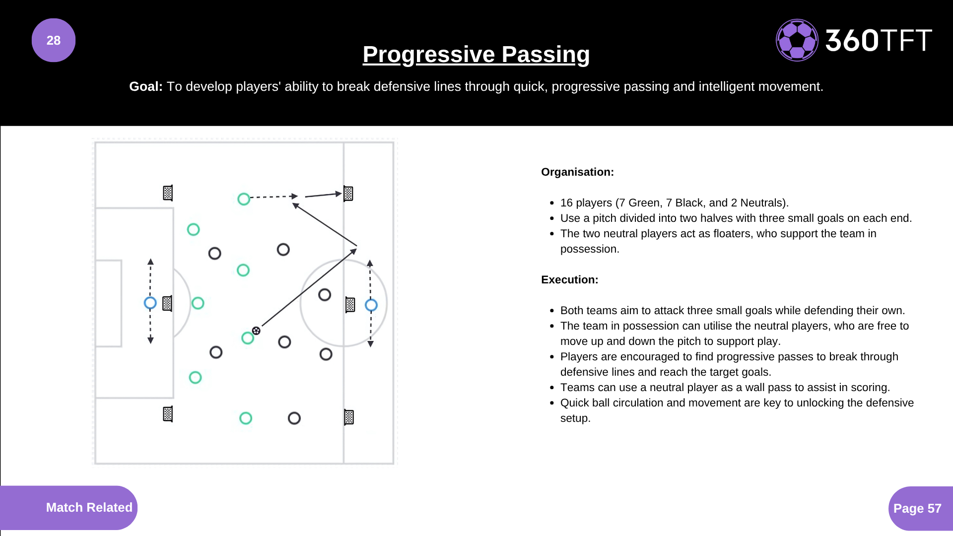 • 16 players (7 Green, 7 Black, and 2 Neutrals). • Use a pitch divided into two halves with three small goals on each end. • The two neutral players act as floaters, who support the team in possession. Execution: • Both teams aim to attack three small goals while defending their own. • The team in possession can utilise the neutral players, who are free to move up and down the pitch to support play. • Players are encouraged to find progressive passes to break through defensive lines and reach the target goals. • Teams can use a neutral player as a wall pass to assist in scoring. • Quick ball circulation and movement are key to unlocking the defensive setup.