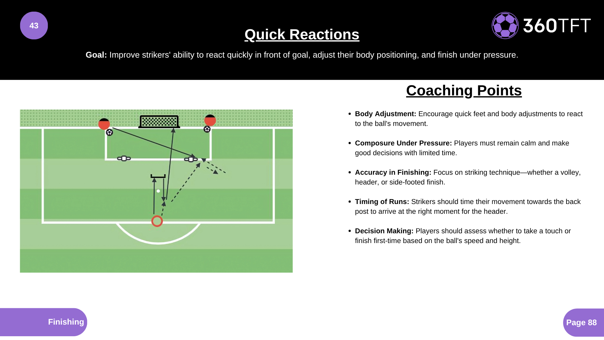 Improve strikers' ability to react quickly in front of goal, adjust their body positioning, and finish under pressure.