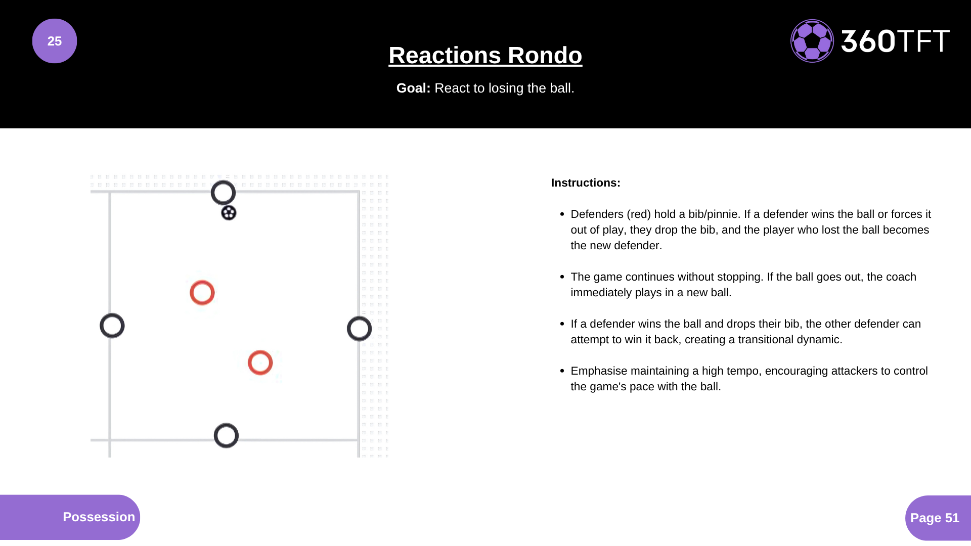 • Defenders (red) hold a bib/pinnie. If a defender wins the ball or forces it out of play, they drop the bib, and the player who lost the ball becomes the new defender. • The game continues without stopping. If the ball goes out, the coach immediately plays in a new ball. • If a defender wins the ball and drops their bib, the other defender can attempt to win it back, creating a transitional dynamic. • Emphasise maintaining a high tempo, encouraging attackers to control the game's pace with the ball.