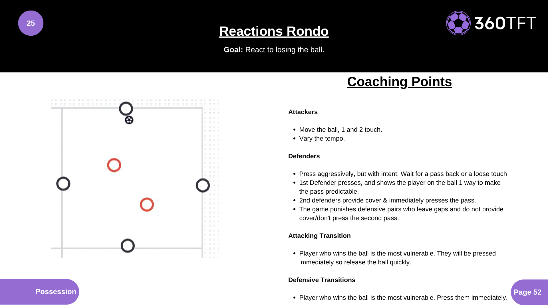 • Attackers • • Move the ball, 1 and 2 touch. • • Vary the tempo. • Defenders • • Press aggressively, but with intent. Wait for a pass back or a loose touch. • • 1st Defender presses, and shows the player on the ball 1 way to make the pass predictable. • • 2nd defenders provide cover & immediately presses the pass. • • The game punishes defensive pairs who leave gaps and do not provide cover/don't press the second pass. • Attacking Transition • • Player who wins the ball is the most vulnerable. They will be pressed immediately so release the ball quickly. • Defensive Transitions • • Player who wins the ball is the most vulnerable. Press them immediately.