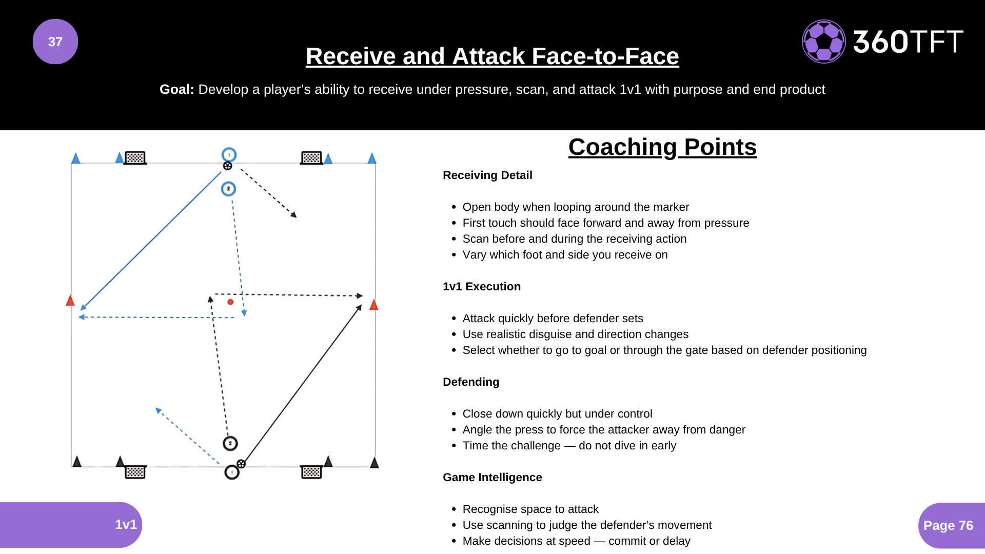 • Open body when looping around the marker • First touch should face forward and away from pressure • Scan before and during the receiving action • Vary which foot and side you receive on • Attack quickly before defender sets • Use realistic disguise and direction changes • Select whether to go to goal or through the gate based on defender positioning • Close down quickly but under control • Angle the press to force the attacker away from danger • Time the challenge — do not dive in early • Recognise space to attack • Use scanning to judge the defender’s movement • Make decisions at speed — commit or delay