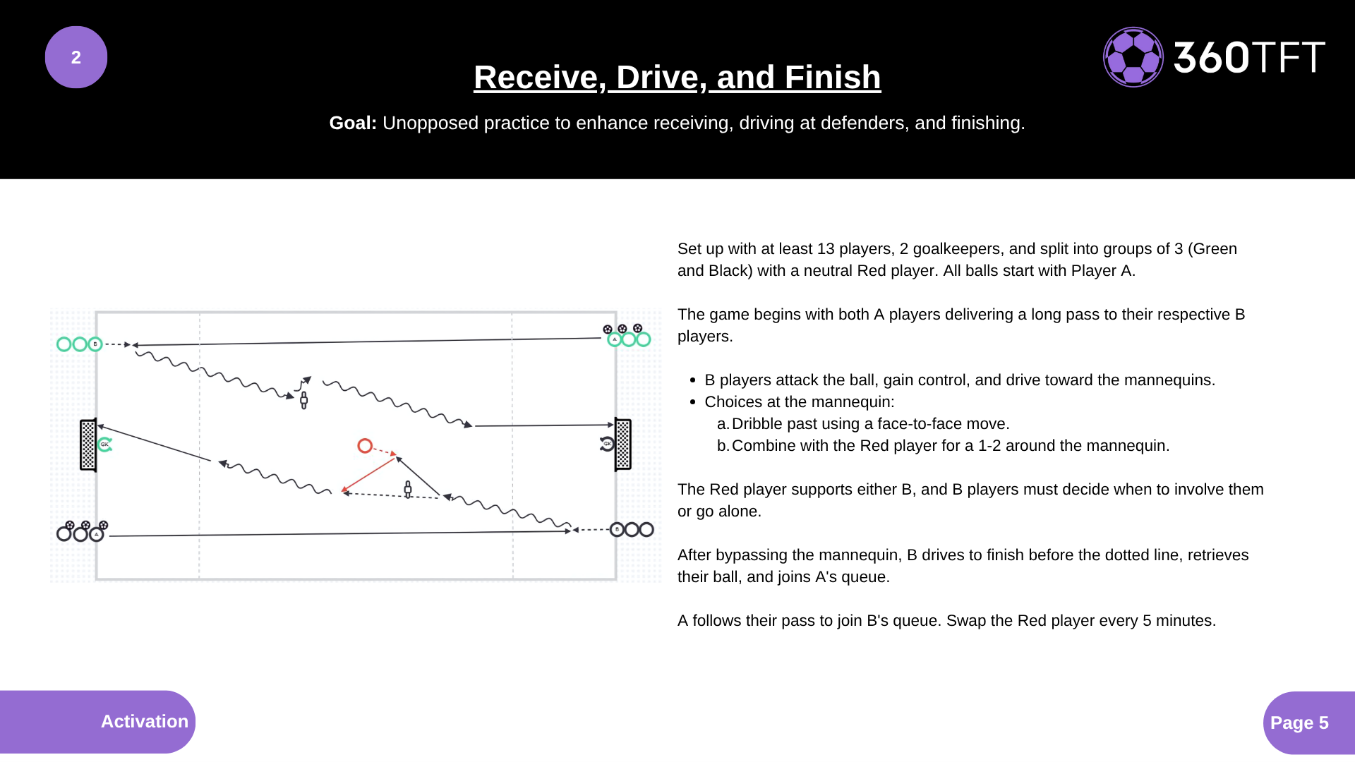 • Set up with at least 13 players, 2 goalkeepers, and split into groups of 3 (Green and Black) with a neutral Red player. All balls start with Player A. • The game begins with both A players delivering a long pass to their respective B players. • B players attack the ball, gain control, and drive toward the mannequins. • Choices at the mannequin: a. Dribble past using a face-to-face move. b. Combine with the Red player for a 1-2 around the mannequin. • The Red player supports either B, and B players must decide when to involve them or go alone. • After bypassing the mannequin, B drives to finish before the dotted line, retrieves their ball, and joins A's queue. • A follows their pass to join B's queue. Swap the Red player every 5 minutes.