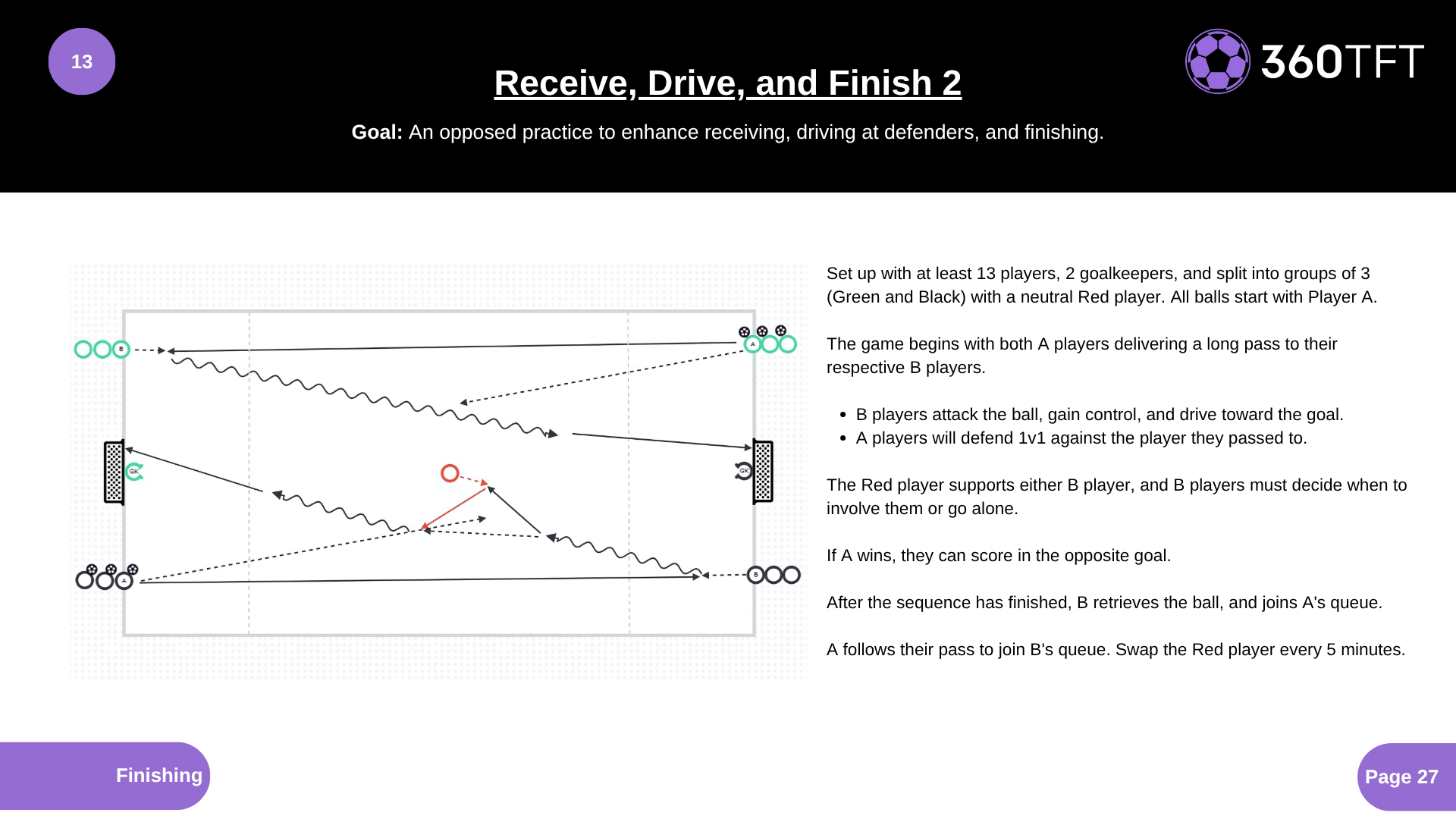 Set up with at least 13 players, 2 goalkeepers, and split into groups of 3 (Green and Black) with a neutral Red player. All balls start with Player A. The game begins with both A players delivering a long pass to their respective B players. • B players attack the ball, gain control, and drive toward the goal. • A players will defend 1v1 against the player they passed to. The Red player supports either B player, and B players must decide when to involve them or go alone. If A wins, they can score in the opposite goal. After the sequence has finished, B retrieves the ball, and joins A's queue. A follows their pass to join B's queue. Swap the Red player every 5 minutes.