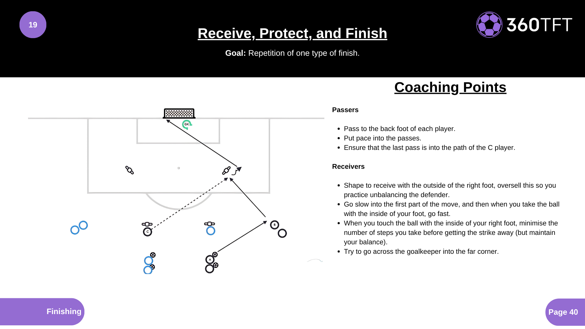 Passers • Pass to the back foot of each player. • Put pace into the passes. • Ensure that the last pass is into the path of the C player. Receivers • Shape to receive with the outside of the right foot, oversell this so you practice unbalancing the defender. • Go slow into the first part of the move, and then when you take the ball with the inside of your foot, go fast. • When you touch the ball with the inside of your right foot, minimise the number of steps you take before getting the strike away (but maintain your balance). • Try to go across the goalkeeper into the far corner.