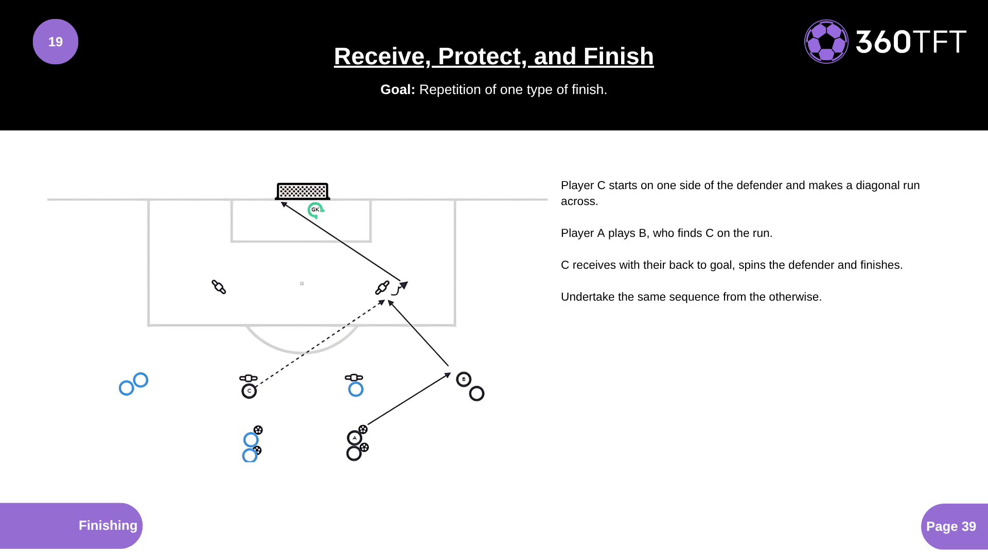 Player C starts on one side of the defender and makes a diagonal run across. Player A plays B, who finds C on the run. C receives with their back to goal, spins the defender and finishes. Undertake the same sequence from the otherwise.