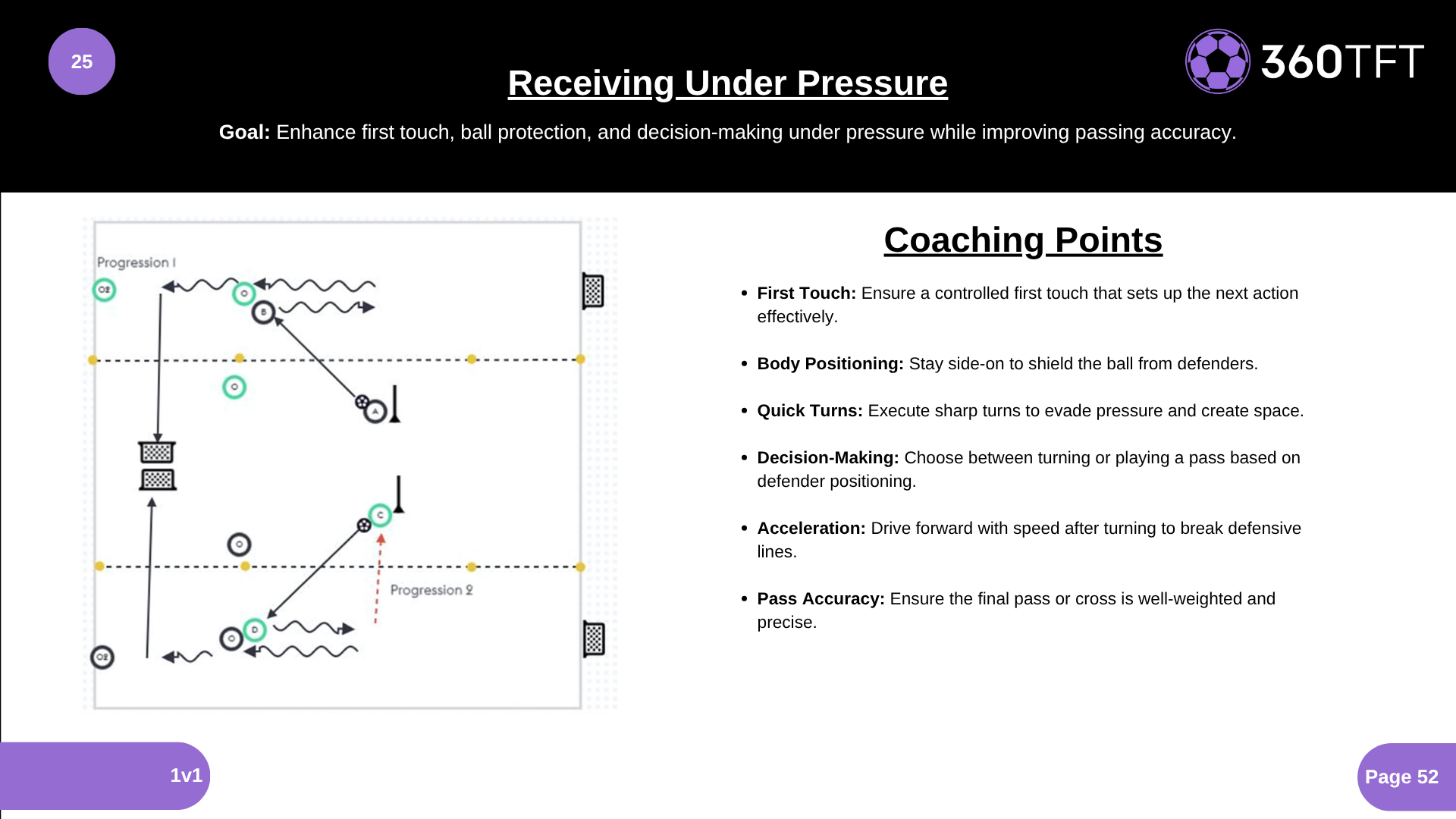 • First Touch: Ensure a controlled first touch that sets up the next action effectively. • Body Positioning: Stay side-on to shield the ball from defenders. • Quick Turns: Execute sharp turns to evade pressure and create space. • Decision-Making: Choose between turning or playing a pass based on defender positioning. • Acceleration: Drive forward with speed after turning to break defensive lines. • Pass Accuracy: Ensure the final pass or cross is well-weighted and precise.