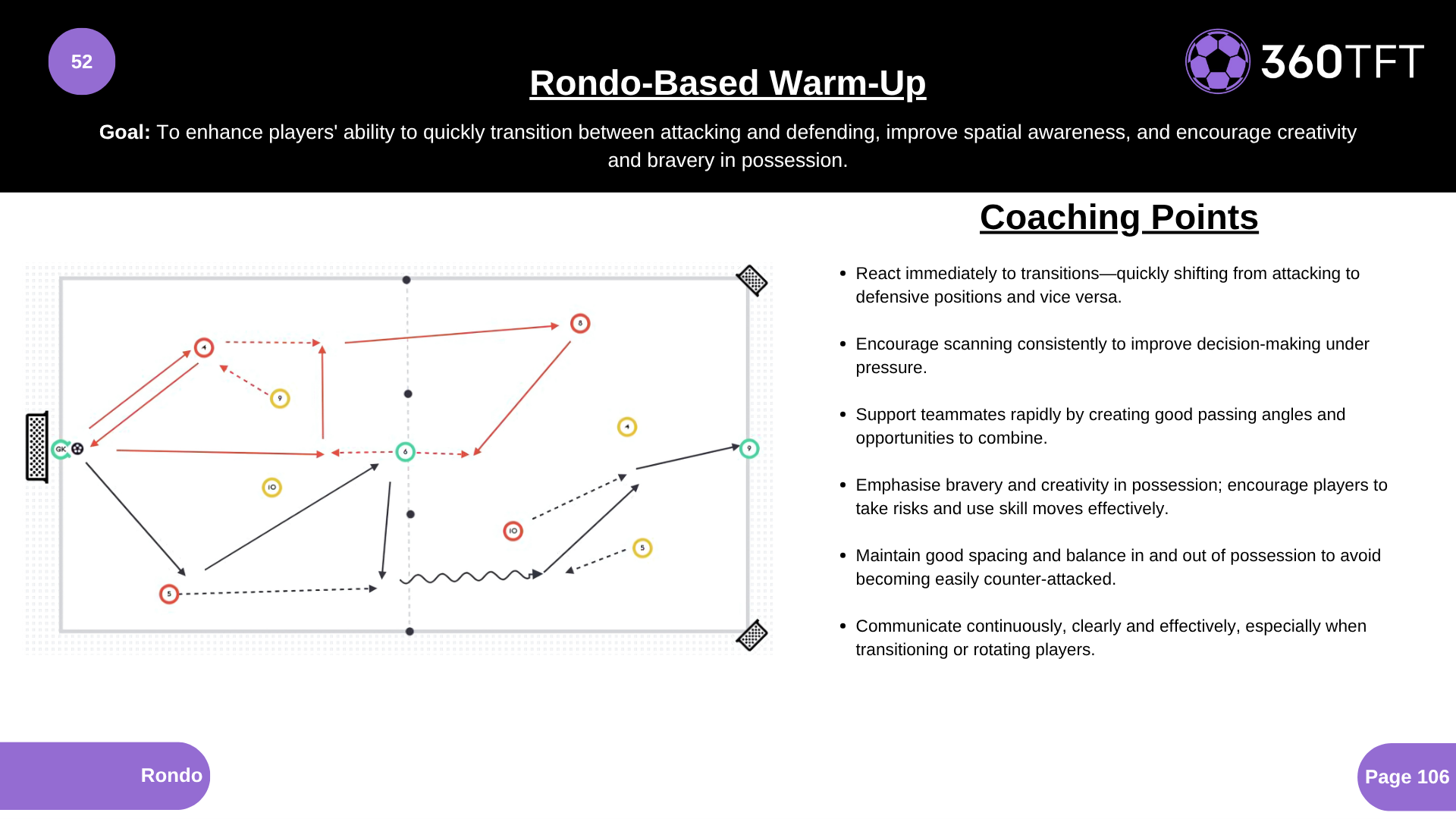 • React immediately to transitions—quickly shifting from attacking to defensive positions and vice versa. • Encourage scanning consistently to improve decision-making under pressure. • Support teammates rapidly by creating good passing angles and opportunities to combine. • Emphasise bravery and creativity in possession; encourage players to take risks and use skill moves effectively. • Maintain good spacing and balance in and out of possession to avoid becoming easily counter-attacked. • Communicate continuously, clearly and effectively, especially when transitioning or rotating players.
