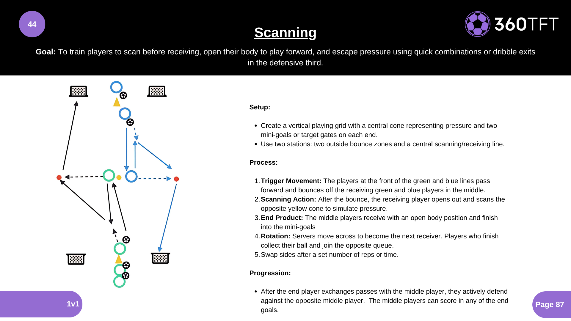 • Create a vertical playing grid with a central cone representing pressure and two mini-goals or target gates on each end. • Use two stations: two outside bounce zones and a central scanning/receiving line. • Trigger Movement: The players at the front of the green and blue lines pass forward and bounces off the receiving green and blue players in the middle. • Scanning Action: After the bounce, the receiving player opens out and scans the opposite yellow cone to simulate pressure. • End Product: The middle players receive with an open body position and finish into the mini-goals. • Rotation: Servers move across to become the next receiver. Players who finish collect their ball and join the opposite queue. • Swap sides after a set number of reps or time.