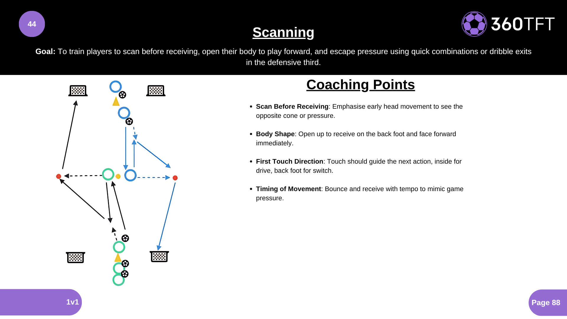 • Scan Before Receiving: Emphasise early head movement to see the opposite cone or pressure. • Body Shape: Open up to receive on the back foot and face forward immediately. • First Touch Direction: Touch should guide the next action, inside for drive, back foot for switch. • Timing of Movement: Bounce and receive with tempo to mimic game pressure.