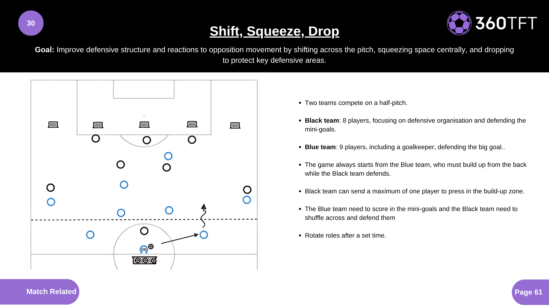 • Two teams compete on a half-pitch. • Black team: 8 players, focusing on defensive organisation and defending the mini-goals. • Blue team: 9 players, including a goalkeeper, defending the big goal. • The game always starts from the Blue team, who must build up from the back while the Black team defends. • Black team can send a maximum of one player to press in the build-up zone. • The Blue team need to score in the mini-goals and the Black team need to shuffle across and defend them. • Rotate roles after a set time.