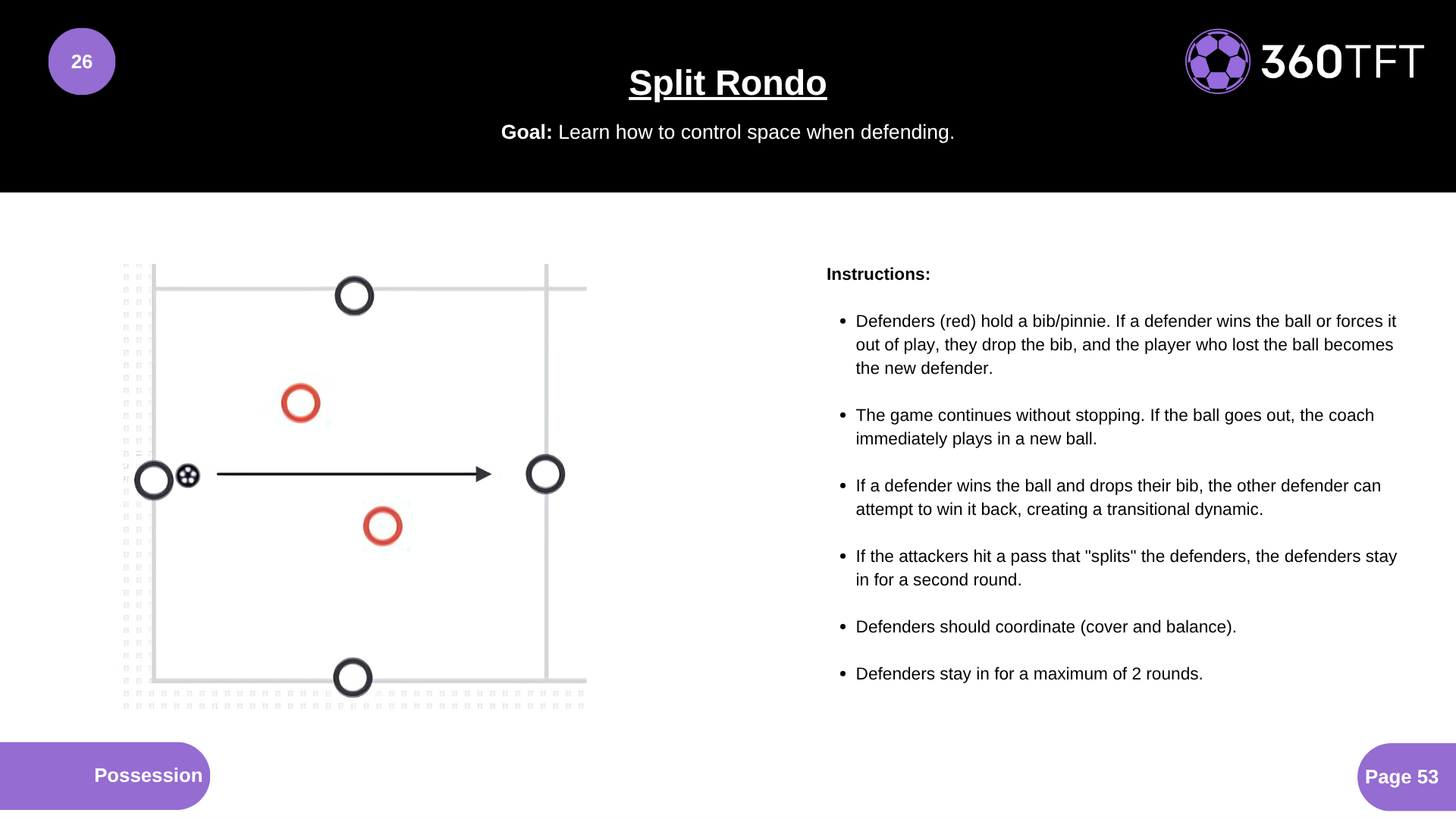 • Defenders (red) hold a bib/pinnie. If a defender wins the ball or forces it out of play, they drop the bib, and the player who lost the ball becomes the new defender. • The game continues without stopping. If the ball goes out, the coach immediately plays in a new ball. • If a defender wins the ball and drops their bib, the other defender can attempt to win it back, creating a transitional dynamic. • If the attackers hit a pass that 'splits' the defenders, the defenders stay in for a second round. • Defenders should coordinate (cover and balance). • Defenders stay in for a maximum of 2 rounds.