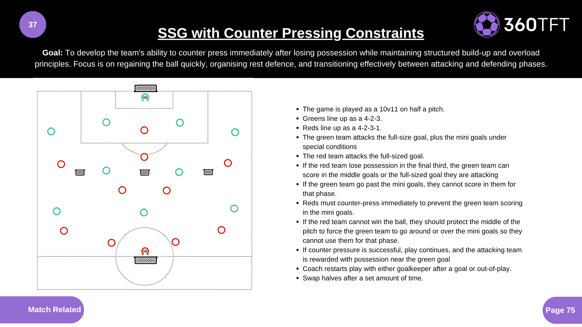 • The game is played as a 10v11 on half a pitch. • Greens line up as a 4-2-3. • Reds line up as a 4-2-3-1. • The green team attacks the full-size goal, plus the mini goals under special conditions. • The red team attacks the full-sized goal. • If the red team lose possession in the final third, the green team can score in the middle goals or the full-sized goal they are attacking. • If the green team go past the mini goals, they cannot score in them for that phase. • Reds must counter-press immediately to prevent the green team scoring in the mini goals. • If the red team cannot win the ball, they should protect the middle of the pitch to force the green team to go around or over the mini goals so they cannot use them for that phase. • If counter pressure is successful, play continues, and the attacking team is rewarded with possession near the green goal. • Coach restarts play with either goalkeeper after a goal or out-of-play. • Swap halves after a set amount of time.