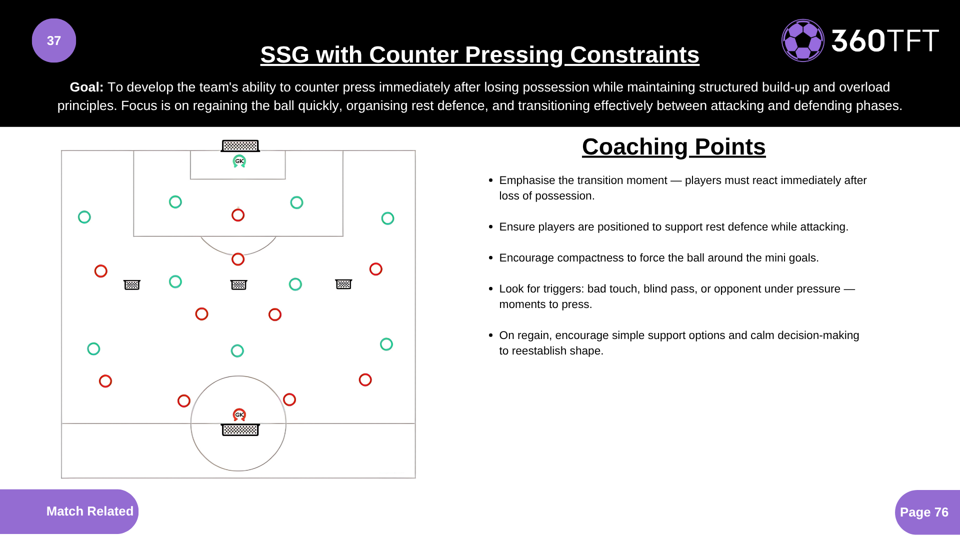 • Emphasise the transition moment — players must react immediately after loss of possession. • Ensure players are positioned to support rest defence while attacking. • Encourage compactness to force the ball around the mini goals. • Look for triggers: bad touch, blind pass, or opponent under pressure — moments to press. • On regain, encourage simple support options and calm decision-making to reestablish shape.