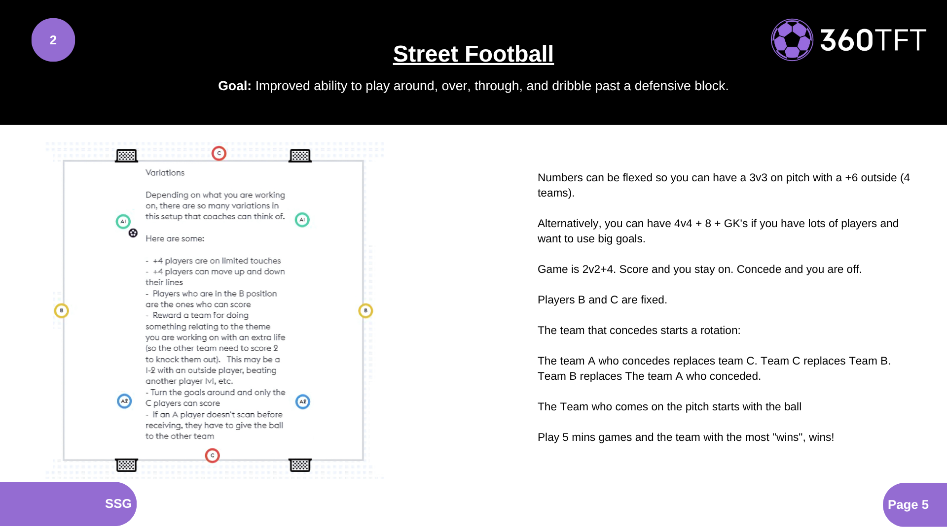 Numbers can be flexed so you can have a 3v3 on pitch with a +6 outside (4 teams). Alternatively, you can have 4v4 + 8 + GK's if you have lots of players and want to use big goals. Game is 2v2+4. Score and you stay on. Concede and you are off. Players B and C are fixed. The team that concedes starts a rotation: The team A who concedes replaces team C. Team C replaces Team B. Team B replaces The team A who conceded. The Team who comes on the pitch starts with the ball Play 5 mins games and the team with the most "wins", wins!