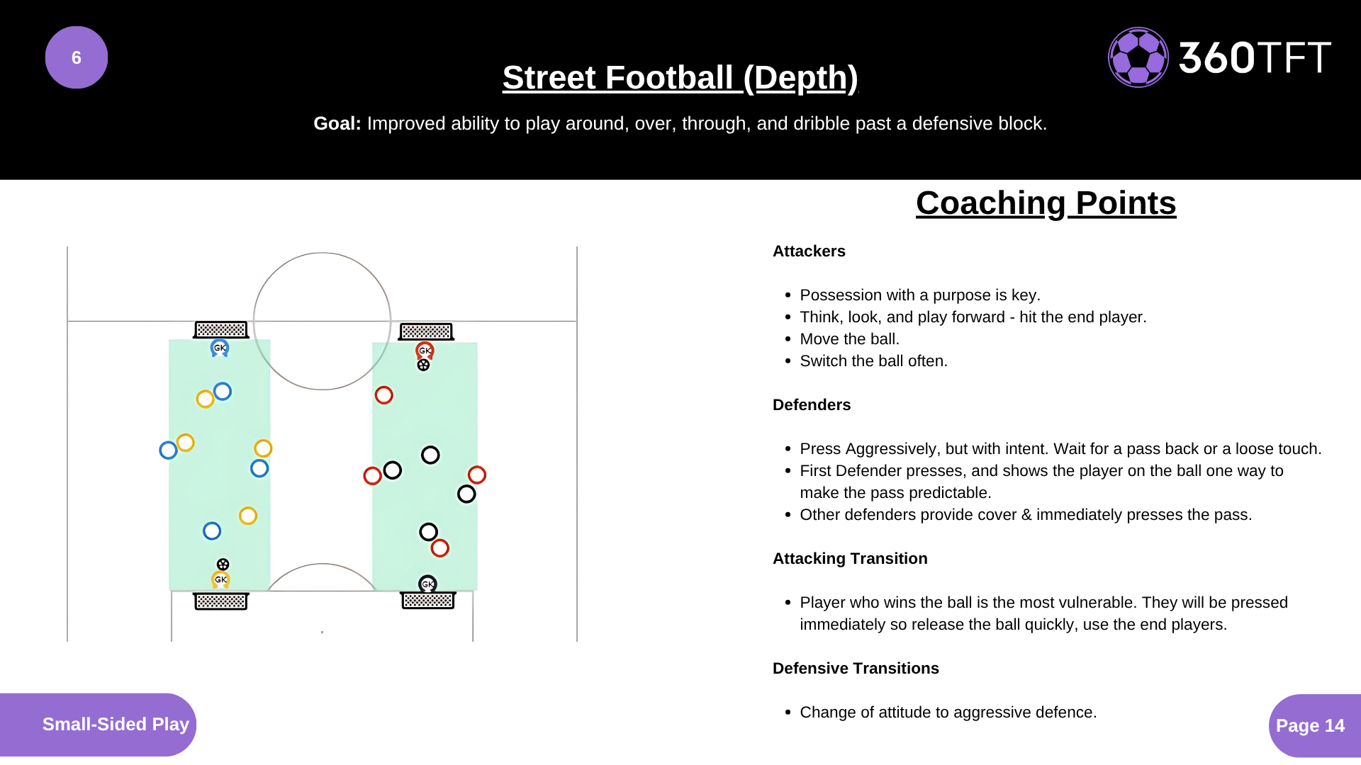 Attacking Points - Possession with a purpose is key. - Think, look, and play forward - hit the end player. - Move the ball. - Switch the ball often. Defenders - Press Aggressively, but with intent. Wait for a pass back or a loose touch. - First Defender presses, and shows the player on the ball one way to make the pass predictable. - Other defenders provide cover & immediately presses the pass. Attacking Transition - Player who wins the ball is the most vulnerable. They will be pressed immediately so release the ball quickly, use the end players. Defensive Transitions - Change of attitude to aggressive defence.