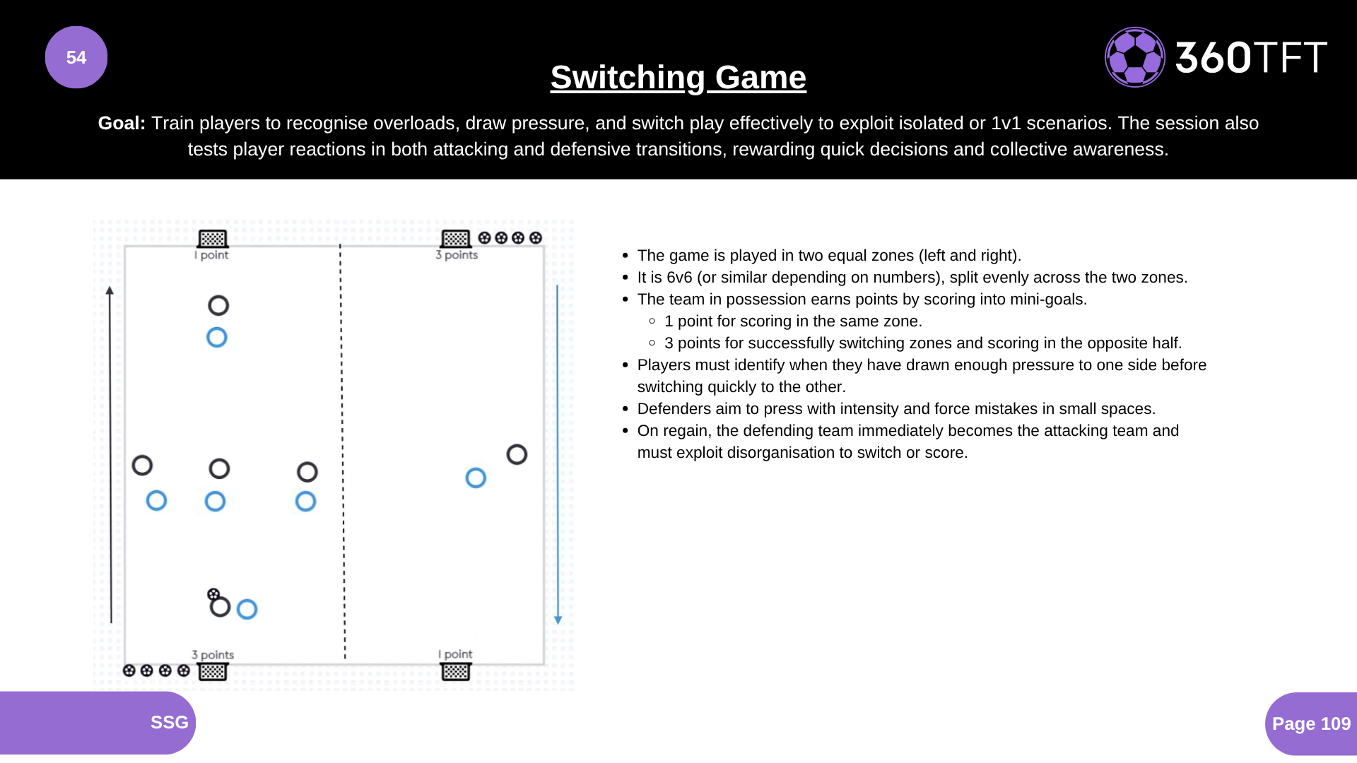 • The game is played in two equal zones (left and right). • It is 6v6 (or similar depending on numbers), split evenly across the two zones. • The team in possession earns points by scoring into mini-goals. ◦ 1 point for scoring in the same zone. ◦ 3 points for successfully switching zones and scoring in the opposite half. • Players must identify when they have drawn enough pressure to one side before switching quickly to the other. • Defenders aim to press with intensity and force mistakes in small spaces. • On regain, the defending team immediately becomes the attacking team and must exploit disorganisation to switch or score.