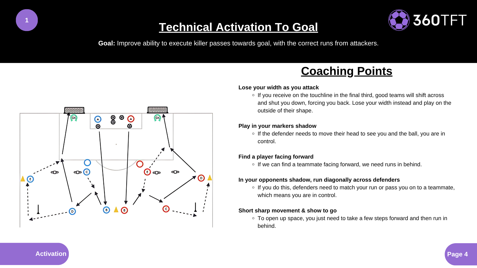 • Lose your width as you attack • Play in your markers shadow • Find a player facing forward • In your opponents shadow, run diagonally across defenders • Short sharp movement & show to go