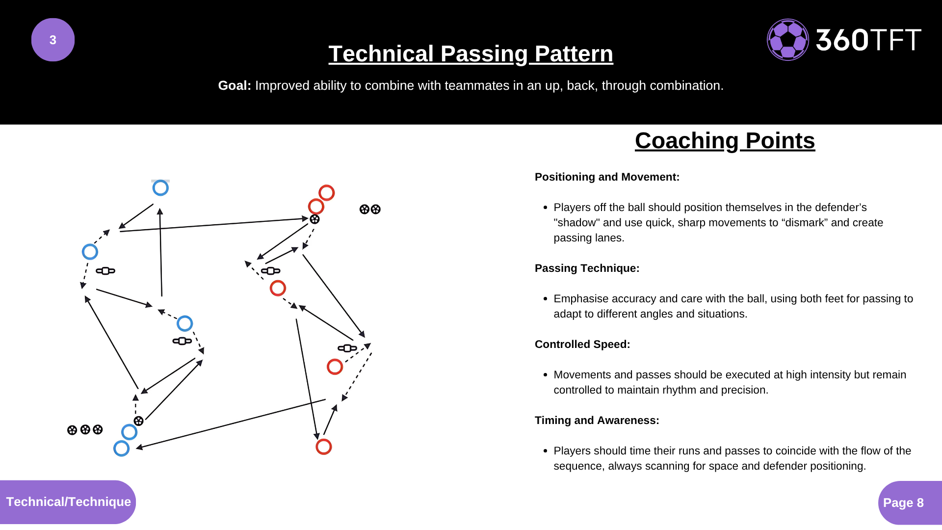 Positioning and Movement: • Players off the ball should position themselves in the defender’s "shadow" and use quick, sharp movements to “dismark” and create passing lanes. Passing Technique: • Emphasise accuracy and care with the ball, using both feet for passing to adapt to different angles and situations. Controlled Speed: • Movements and passes should be executed at high intensity but remain controlled to maintain rhythm and precision. Timing and Awareness: • Players should time their runs and passes to coincide with the flow of the sequence, always scanning for space and defender positioning.