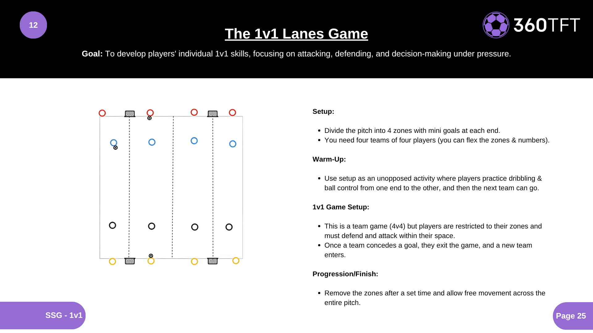 Setup: • Divide the pitch into 4 zones with mini goals at each end. • You need four teams of four players (you can flex the zones & numbers). Warm-Up: • Use setup as an unopposed activity where players practice dribbling & ball control from one end to the other, and then the next team can go. 1v1 Game Setup: • This is a team game (4v4) but players are restricted to their zones and must defend and attack within their space. • Once a team concedes a goal, they exit the game, and a new team enters. Progression/Finish: • Remove the zones after a set time and allow free movement across the entire pitch.